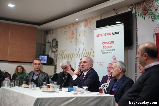 Kendisinin spor camiasından gelen bir isim olması ve katılımcıların da uzun yıllardır aynı sıkıntılara çözüm için birlikte çalıştıkları spor adamları olması nedeni ile kendisinin vaatlerde bulunma gereği hissetmediğini, buna da ihtiyaç duymadığını söyleyen Tosun, ”Bakınız Beykoz’da çözülemeyecek hiçbir şey yok. Yeter ki sizler sağlam birer irade ortaya koyun. Beykoz’un üzerine çöken bu kâbusu bertaraf etmemiz gerekiyor. Ben de sizlerin yaşadığı sorunların bire bir muhatabı olan bir kardeşinizim. Vatandaşlarımızdaki kuşkuları bende hissedip yaşamakta idim. “Artık sizin yerinize biz düşünürüz, biz yaparız, biz çözüme kavuştururuz” diyenlere inanılmasın. İrademize sahip çıkalım, öz güvenimizi yukarıya çıkaralım, sizlerden tek bunu istiyorum. Beni sadece Belediye Başkanı seçtirin demiyorum, girin koluma destek olun çözüm yolunda hep birlikte mesafe alalım, çaba sarf edelim diyorum. O zaman bu sorunlar aşılır, kentimiz gelişir, değerlerimize sahip çıkılır, çocuklarımız mutlu olur, ileride evlendiklerinde Beykoz’dan kaçıp gitmeyi düşünmez, mecbur kalmaz. Son 10 yılda binlerce kişi bu ilçeden farklı yerlere gitti, burada ne iş ne de oturacak ev kaldı, insanımız Tekkeköy’e taşınıyor. Bu sorunlara çözüm bulacak uzmanlarımız da yollarımız da yöntemlerimiz de hazır. Bakınız araya bir soru işareti koyup açmıyorum, fakat çok kötü bir durum ortada var. ” şeklinde konuştu.