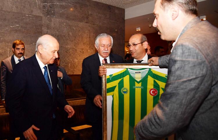 Toplantı sonrasında MHP İlçe Başkanı Oğuzhan Karaman, Genel Başkan Yardımcısı Fethi Yıldız ile beraber Genel Başkan Devlet Bahçeli’ye kulüp forması hediye etti.