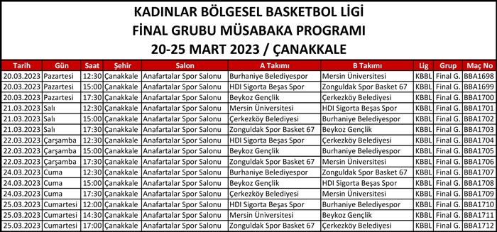 20-25 Mart tarihlerinde Çanakkale Anafartalar Spor Salonu’nda gerçekleşecek müsabaka da Beykoz Basketbol Kulübü, Çerkezköy Belediyesi, Zonguldak Spor Basket 67, Burhaniye Belediyespor, HDI Sigorta Beşas Spor ve Mersin Üniversitesi ile karşılaşmaya çıkacak.