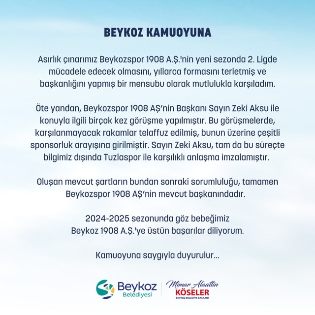 Köseler, “Bu görüşmelerde karşılanmayacak rakamlar telaffuz edilmiş, bunun üzerine çeşitli sponsorluk arayışına girilmiştir. Sayın Zeki Aksu, bu süreçte bilgimiz dışında Tuzlaspor ile karşılıklı anlaşma imzalamıştır. Oluşan mevcut şartların bundan sonraki sorumluluğu, tamamen Beykoz 1908 AŞ’nin mevcut başkandadır. 2024-2025 sezonunda göz bebeğimiz Beykoz 1908 AŞ’ye başarılar diliyorum” ifadelerini kullandı.