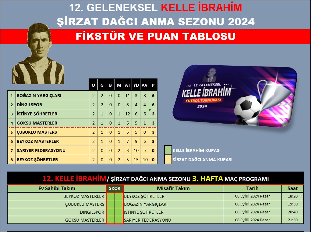 Kelle İbrahim Masterler-Veteranlar Futbol Turnuvasında 2.Hafta maçları kapsamında sahaya çıkan takımlardan Boğazın Yargıçları Masterler Takımı, ilk haftanın galiplerinden Göksu Masterler Takımını 3-1 mağlup etti.