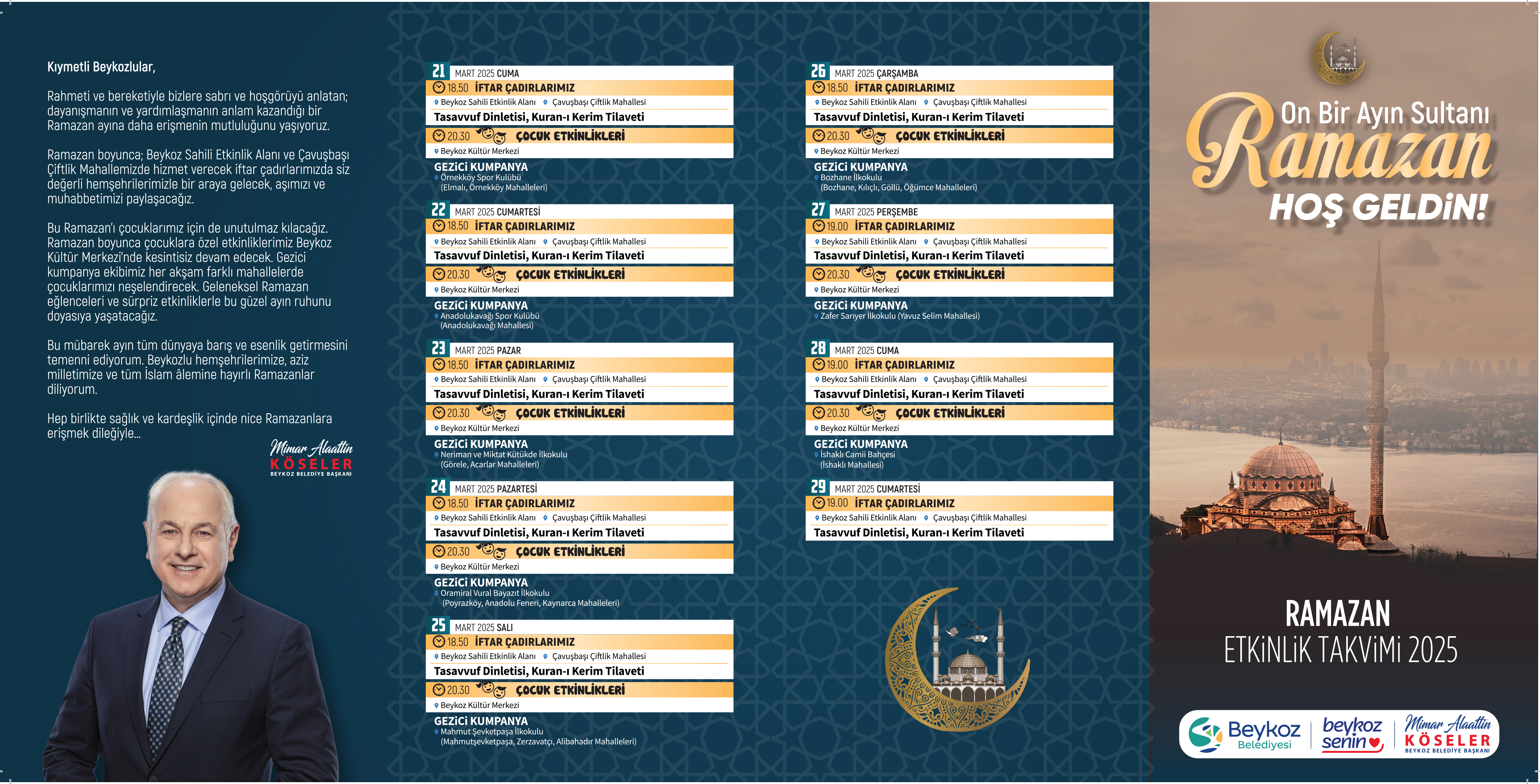 Beykoz Belediyesi, Ramazan ayı boyunca Beykoz Sahili Etkinlik Alanı ve Çavuşbaşı Çiftlik Mahallesi'nde kurduğu İftar Çadırı’nda binlerce ilçe sakinini, aynı sofrada buluşturarak Ramazan’ın bereketini ve dayanışma ruhunu yaşatacak. Bu manevi ayda çocukları da unutmayan Beykoz Belediyesi, Ramazan ayı boyunca mahalle mahalle gezici kumpanyalar düzenleyerek miniklere eğlence dolu anlar yaşatacak.