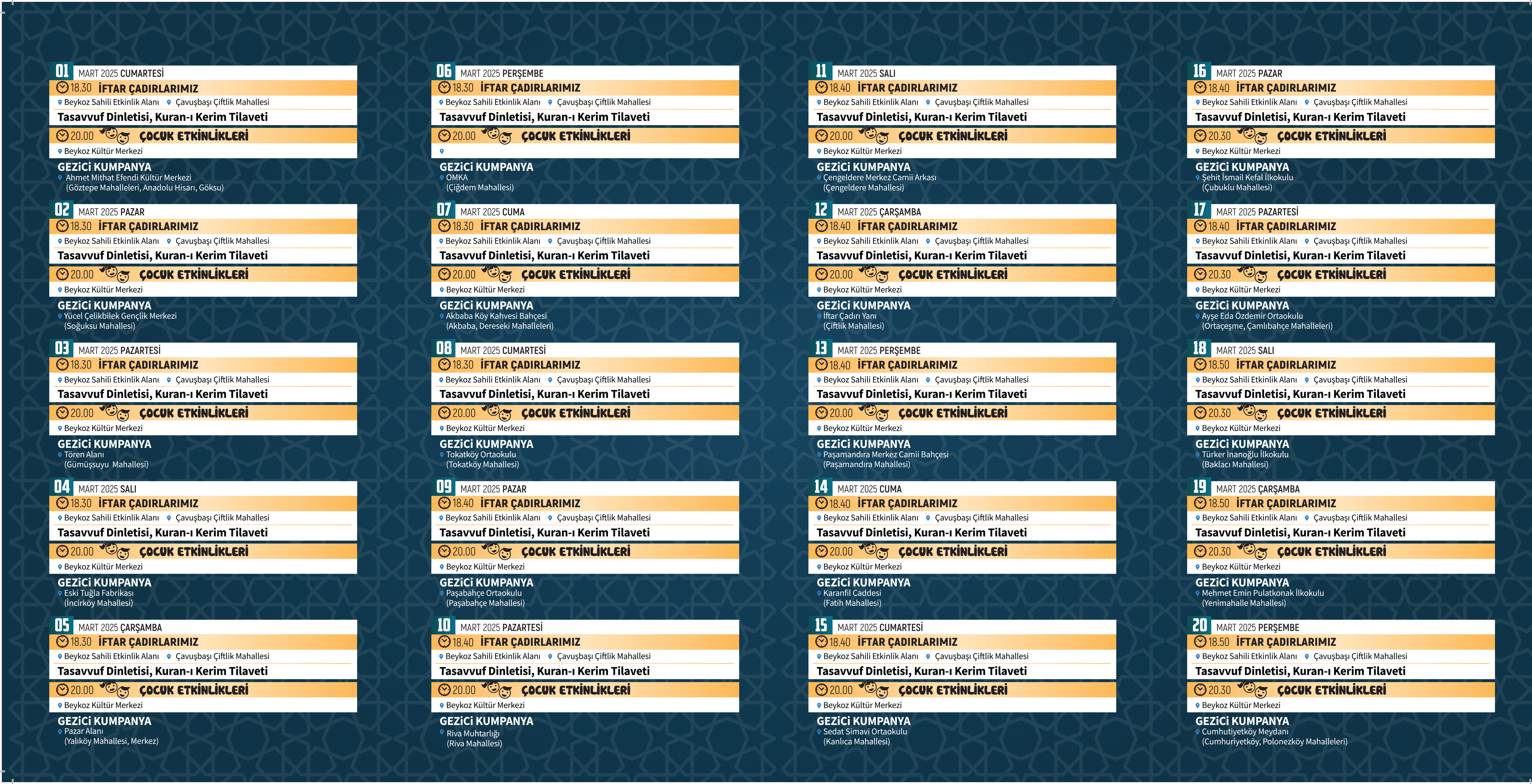 Beykoz Kültür Merkezi’nde sabit olarak devam edecek çocuk etkinliklerinin yanı sıra, gezici kumpanya ekibi, her akşam farklı mahalleleri ziyaret ederek miniklere geleneksel Ramazan eğlenceleri sunacak. Ramazan boyunca çocuklara özel etkinliklerde yüz boyama, palyaço gösterileri, Karagöz ve Hacivat, zumba, İbiş̧ ve kukla gösterileri ile çocuklar doyasıya eğlenecek. Patlamış̧̧ mısır, pamuk şeker ve macun ikram edilecek etkinliklerde çocuklar, eğlenceli Ramazan akşamları yaşayacak.Ramazan ayı boyunca gerçekleşecek gezici kumpanya noktaları şu şekilde: