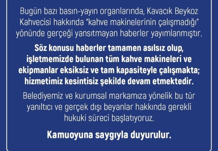 “Bazı basın yayın organlarında, Kavacık Beykoz Kahvecisi hakkında kahve makinelerinin çalışmadığı yönünde gerçeği yansıtmayan haberler yayımlanmıştır. Söz konusu haberler tamamen asılsız olup, işletmemizde bulunan tüm kahve makineleri ve ekipmanlar eksiksiz ve tam kapasiteyle çalışmakta, hizmetimiz kesintisiz bir şekilde devam etmektedir.”Ayrıca Beykoz Belediyesi, hem kurumsal markası olan Beykoz Kahvecisi’ni hem de kurumu hedef alan bu tür yanıltıcı beyanlara karşı hukuki süreç başlatıldığını da duyurdu.