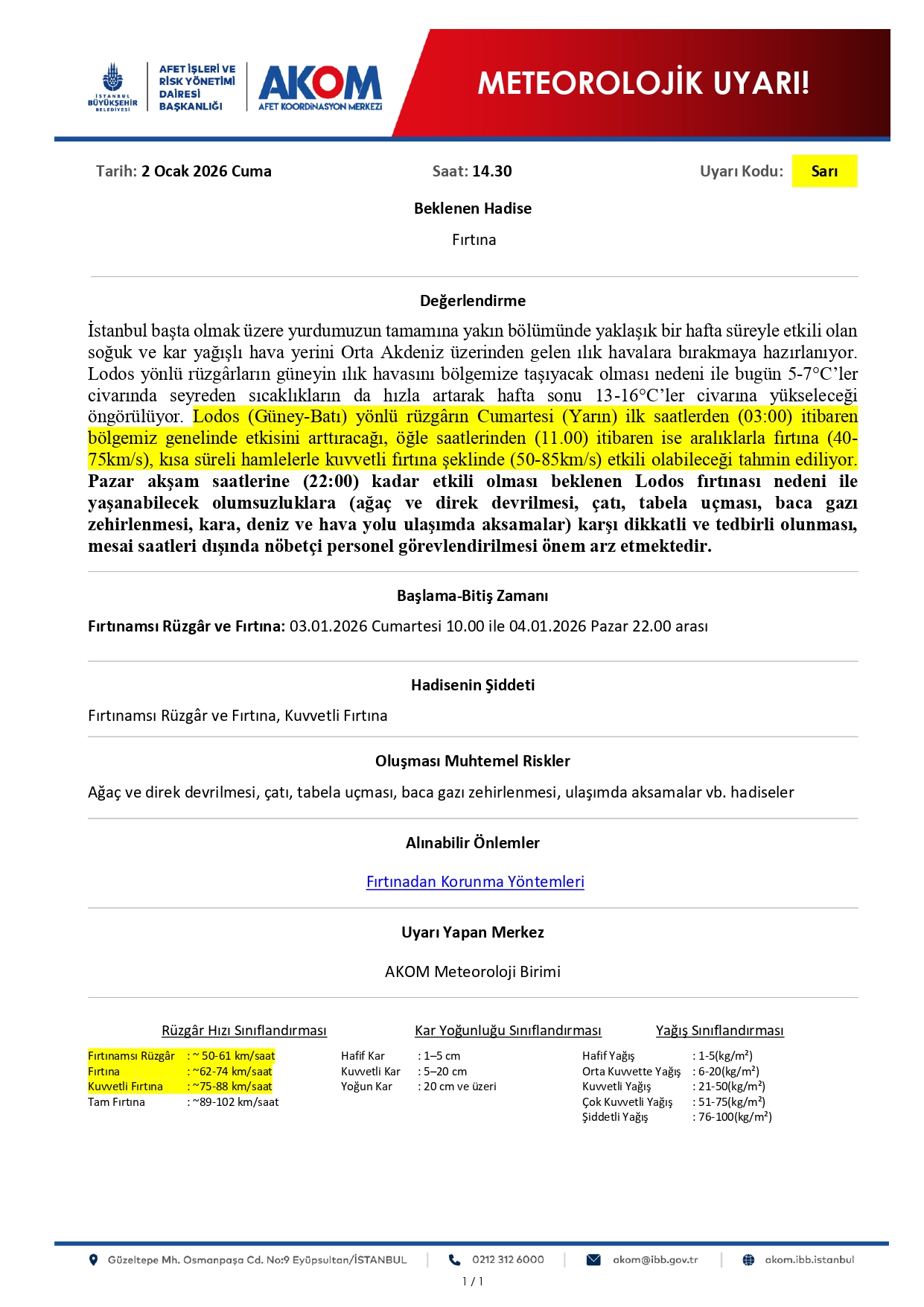 AKOM, Pazar günü saat 22.00’ye kadar etkili olması öngörülen lodos fırtınası nedeniyle özellikle çatı uçması, ağaç ve direk devrilmesi, baca gazı zehirlenmeleri ve ulaşımda yaşanabilecek aksamalar konusunda dikkatli ve tedbirli olunması gerektiğini vurguladı.
