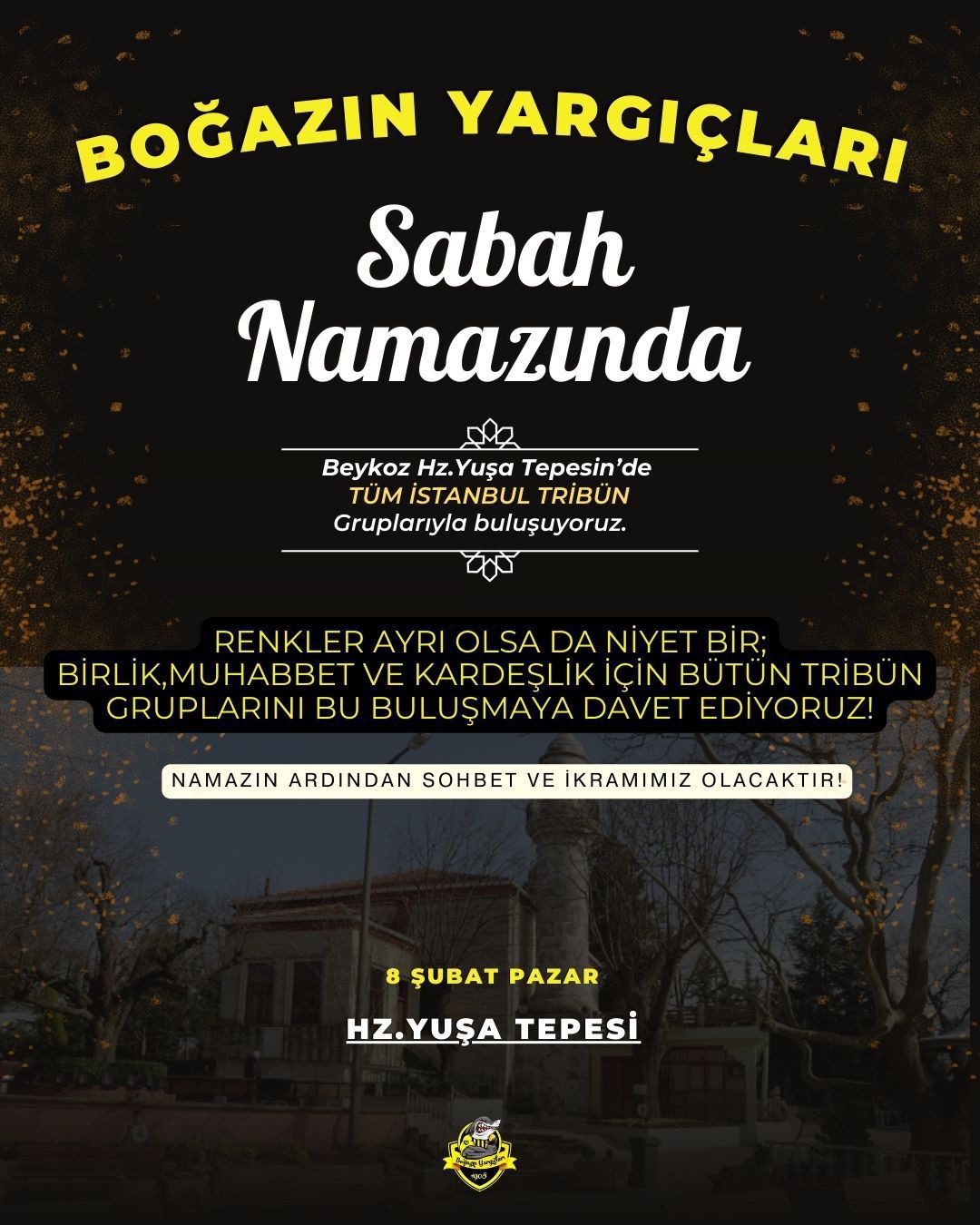 “Boğazın Yargıçları” taraftar grubu tarafından yapılan etkinlik duyurusunda, birlik ve kardeşlik vurgusu öne çıktı. Açıklamada, “Boğazın Yargıçları taraftar grubu olarak; 8 Şubat Pazar günü Beykoz Hz. Yuşa Tepesi sabah namazında tüm İstanbul tribünleriyle bir araya geliyoruz” ifadelerine yer verildi.