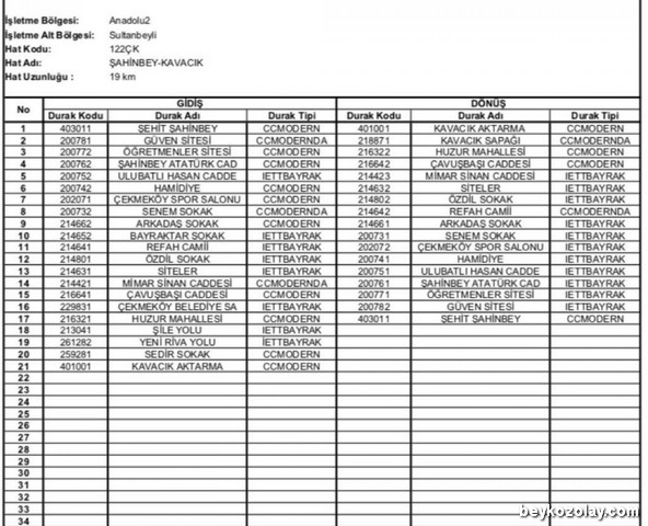 Beykoz Belediyesi ve İETT arasında yapılan görüşmeler neticesinde Kavacık – Çekmeköy arası otobüs hattı konuldu. 122ÇK otobüs hattı, Şile Yolu Fatih Sultan Mehmet Köprüsü girişini kullanarak Kavacık’a ulaşıyor. Şahinbey, Mimar Sinan, Çavuşbaşı Caddesi, Çekmeköy, Şile Yolu, Kavacık Aktarma üzerinde 21 duraklı 19 km’lik hatta yolculuk, Şahinbey durağından başlayarak, Kavacık Aktarma İstasyonu’nda son buluyor.