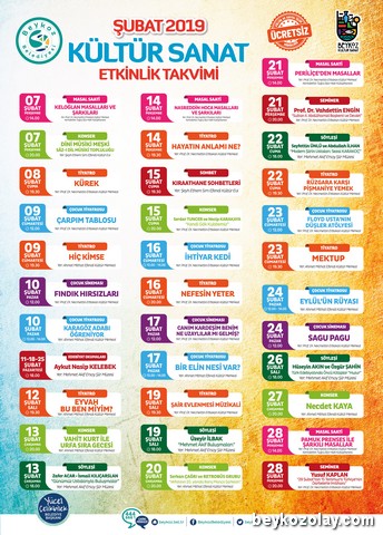Şubat takviminde, çocuk, yetişkin tiyatroları, masal saatleri, edebiyat okumaları ve çeşitli müzik dallarındaki konserlerin yanı sıra usta şair ve yazarların anılacağı, söyleşi ve seminer programları yer alıyor.