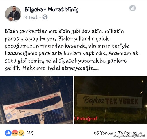 Konuyla ilgili Beykoz İyi Parti Belediye Başkan Adayı Bilgehan Murat Miniç sosyal medya hesabından tepki göstererek şunları aktardı; “Bizim pankartlarımız sizin gibi devletin, milletin parasıyla yapılmıyor. Bizler yıllardır çoluk çocuğumuzun rızkından keserek, alnımızın teriyle kazandığımız paralarla bunları yaptırdık. Anamızın ak sütü gibi temiz, helal siyaset yaparak bu günlere geldik. Hakkımızı helal etmeyeceğiz…”