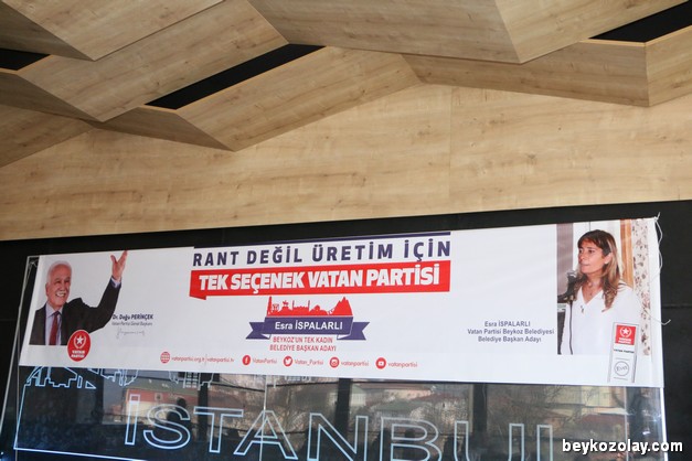 Beykoz Belediye Başkan Adayı Esra İspalarlı, “Yaklaşan yerel seçimler nedeni ile partimizin, Beykoz İlçe Örgütü tarafından Vatan Partisi Beykoz Belediye Başkan adaylığı gibi onurlu bir hizmet görevine uygun görüldüm.” Diyerek adaylığını açıkladı.İspalarlı konuşmasının devamında şu ifadelere yer verdi: “3 Şubat 2019’da, Vatan Partisi İstanbul İl Örgütümüzün gerçekleştirdiği aday tanıtım toplantısı ile ben de dahil olmak üzere İstanbul Belediye Başkan Adaylarımız resmen açıklandı.