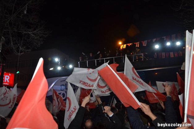 Genel Başkan Temel Karamollaoğlu vatandaşlara şöyle seslendi: “Bu seçim öyle bir noktaya getirildi ki artık sadece mahalli bir seçim değil. Bu seçim sanki genel seçimmiş gibi bir havaya büründürüldü. Zaten reklam panolarına baktığınız zaman belediye başkan adaylarının esamesi bile görünmüyor. Yolsuzluk belediyelerin kimliği haline geldi. Yolsuzluk yoksa bile diğer taraftan korkunç bir israf var. Türkiye 31 Mart seçimleriyle yeni bir döneme girecek. 31 Mart’a kadar gece-gündüz çalışıp sandıktan Saadet Partisi’ni çıkarmalıyız. Oturduğumuz şehirlerin nasıl yönetileceği halkımızın ihtiyacının nasıl giderileceği konusunda bizim çok önemli projelerimiz var. Türkiye 31 Mart seçimleriyle yeni bir döneme girecek. Bu anlamda atacağımız ilk adım bize oy vermeyen kardeşlerimizi de kucaklamak olacak. Biz farklıyız, kimseyi hakir görmeyiz. Muhaliflerin itirazlarından ders alır, yaptığımız işi daha güzel yaparız. Bize oy veren kardeşlerimizle birlikte bize oy vermeyen kardeşlerimizi de kucaklayacağız. Biz işi yandaşımıza değil, ehil olana vereceğiz.”