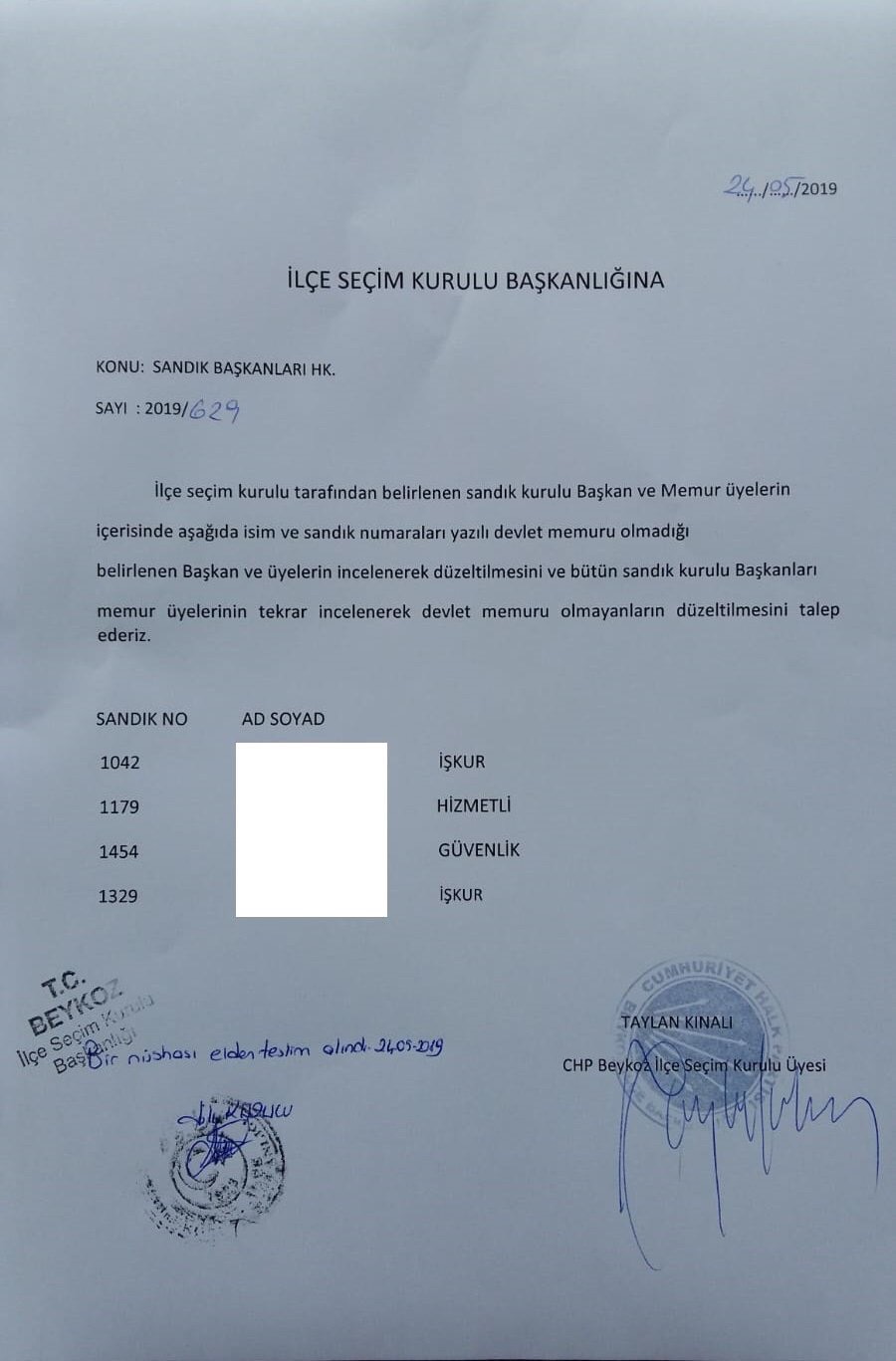 CHP, Beykoz İlçe Seçim Kuruluna yaptığı itiraz başvurusuyla kamu görevlisi olmayan 4 kişinin sandık kurullarındaki görevlerinden alınmasını talep etti.