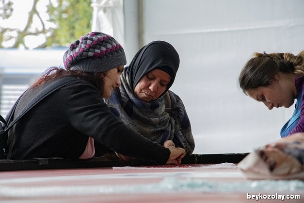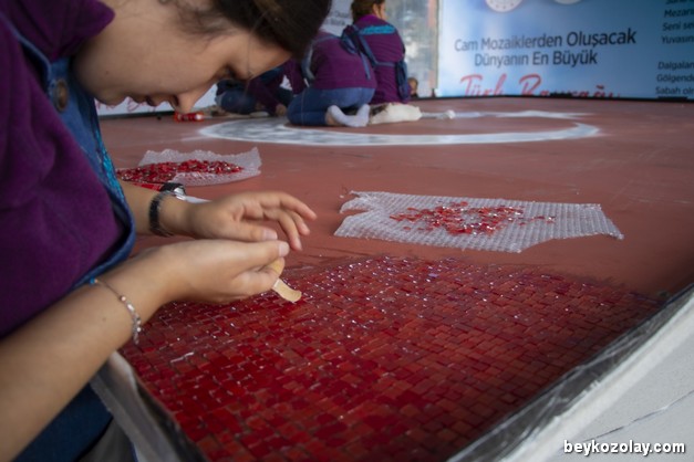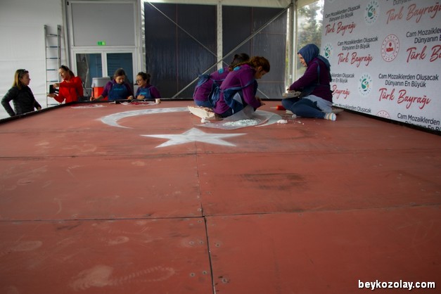Beykoz Belediyesi önündeki 15 Temmuz Şehitler Meydanı’nda kurulan çadırda, 240 bin adet cam mozik parçasıyla, 6 x 4 m ölçülerinde hazırlanacak Türk Bayrağı’nın yapımı Barbaros Hayrettin Paşa Mesleki ve Teknik Anadolu Lisesi öğrencilerinin ilk parçayı koymasıyla başladı.