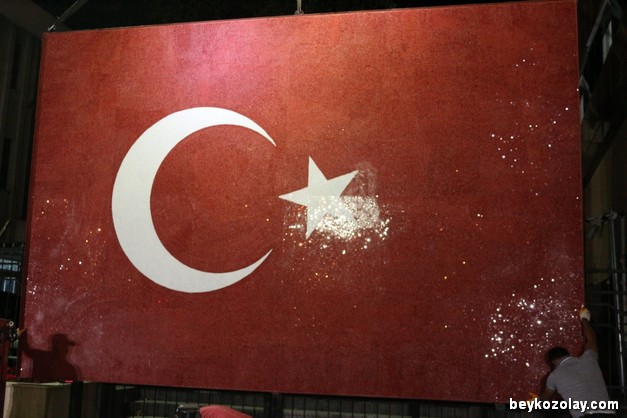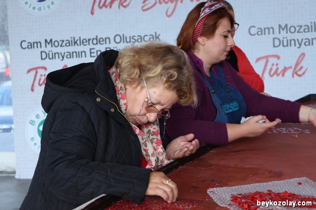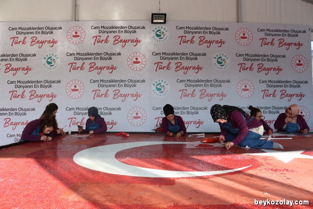 Beykoz Belediyesi önündeki meydanda kurulan çadırda, 240 bin adet cam mozik parçasıyla, 6 x 4 m ölçülerinde hazırlanan Türk Bayrağı’nın yapımına toplumun tüm kesimlerinden destek ve katkı geldi.