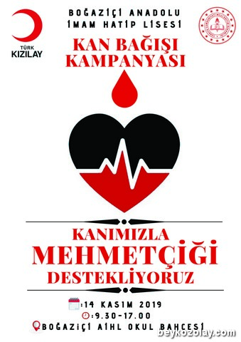 14 Kasım 2019 Perşembe günü saat 09.30 ila saat 17.00 arasında Boğaziçi Anadolu İmam Hatip Lisesi bahçesinde gerçekleştirilecek.Sivil toplum kuruluşlarının da destek verdiği kampanya kapsamında, Barış Pınarı Harekatını yürüten Türk Silahlı Kuvvetlerine ve Kahraman Mehmetçiğe destek amaçlı düzenlenen kampanya gün boyu devam edecek olup, Beykoz’daki resmi kurum ve Sivil Toplum Kuruluşlarının da katılımıyla rekor miktarda kan bağışına ulaşmayı hedefliyor.