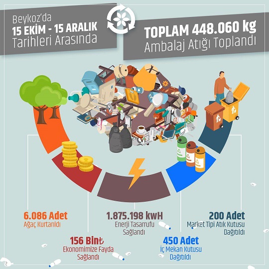 15 Kasım-15 Aralık tarihlerini kapsayan 1 aylık periyotta ise 448 bin 066 kg ambalaj atığı toplandı. Toplanan atıklarla 1 ayda 6 bin ağaç yeşil kalırken, 1 milyon 875 bin 198 kwH’lık enerji tasarrufu ve mili ekonomiye 156 bin TL’lik katkı sağlandı.