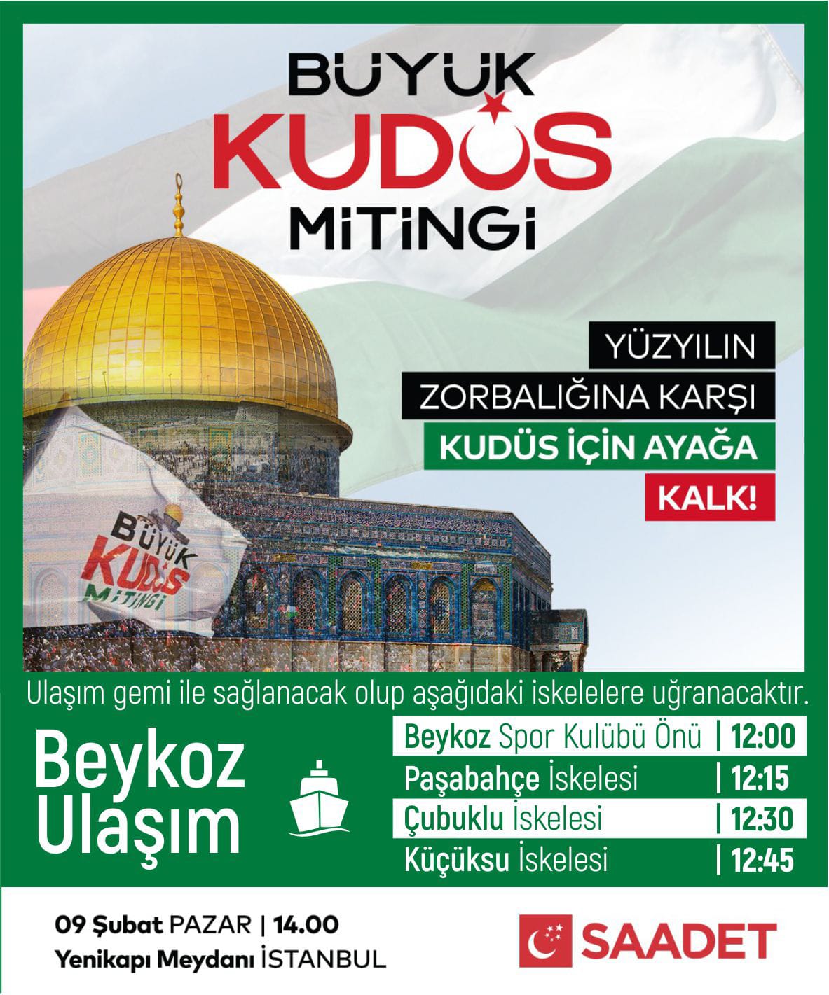 Saadet Partisi, 9 Şubat Pazar günü saat 14.00’te Yenikapı Meydanı’nda “Büyük Kudüs Mitingi” düzenliyor.
