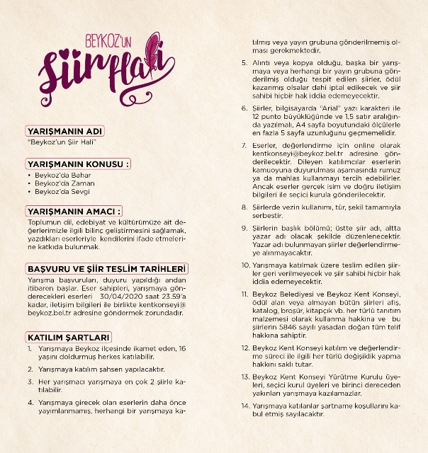 Şiir sahipleri yarışmaya gönderecekleri eserleri 30 Nisan 2020 Perşembe günü saat: 23:59’a kadar iletişim bilgileriyle birlikte kentkonseyi@beykoz.bel.tr adresine ulaştırmak zorunda.