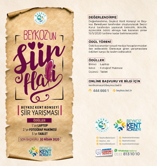 Beykoz’u en güzel anlatan şiirlerin ilçenin kültür-sanat belleğine kazandırılacağı yarışmanın birincisine laptop, ikincisine fotoğraf makinesi, üçüncüsüne ise tablet hediye edilecek.