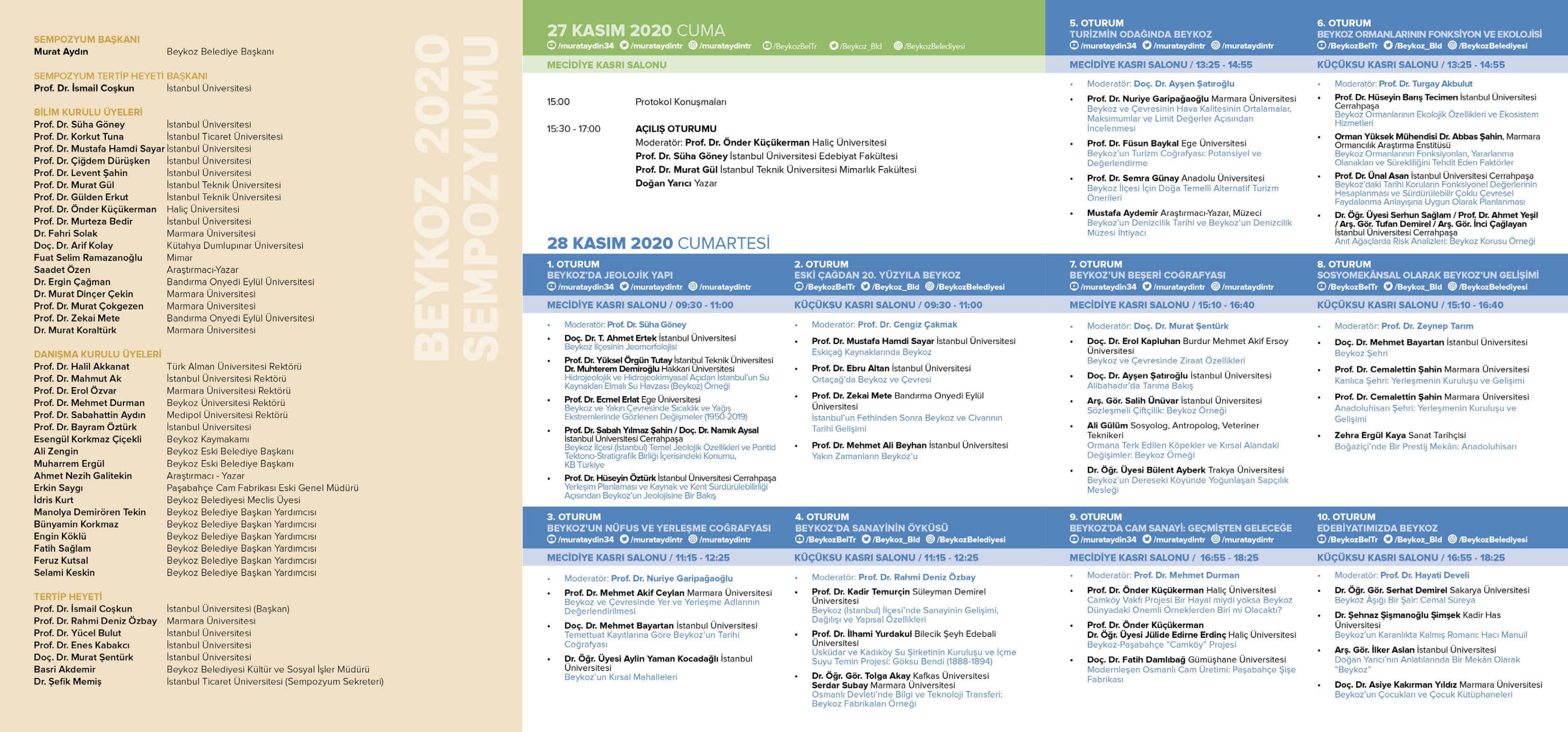 Geçen yıl olduğu gibi bu yıl da geçmişin ışığıyla geleceği aydınlatmayı amaçlayan sempozyum; çok sayıda farklı disiplinden gelen bilim insanları ve Beykoz üzerine çalışmış eser vermiş isimleri ağırlıyor. Tertip Heyeti Başkanlığını Prof. Dr. İsmail Coşkun’un üstlendiği ve 128 akademisyen ile uzmanın yer aldığı sempozyumda 18 oturumda 70 bilimsel tebliğ sunulacak.
