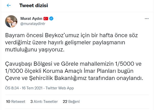 “Bayram öncesi Beykoz’umuz için bir hafta önce söz verdiğimiz üzere hayırlı gelişmeler paylaşmanın mutluluğunu yaşıyoruz.