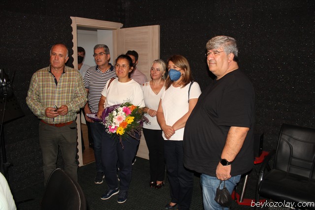Derneğin kayıt stüdyosu incelenirken, Dernek Başkan Yardımcısı ve Stüdyo Sorumlusu Orhan Önal konuklara stüdyonun işleyişiyle ilgili detaylı bilgi aktarması ve çekilen hatıra fotoğrafları sonrasında, stüdyo konusunu ilk olarak ilgililere aktaran İlçe Tapu Müdür Yardımcısı Aysun Öztürk Dernek adına kayıt stüdyosunun ana sponsoru BETAK Başkanı Hatice Selçuk’a bir buket çiçek takdim etti.