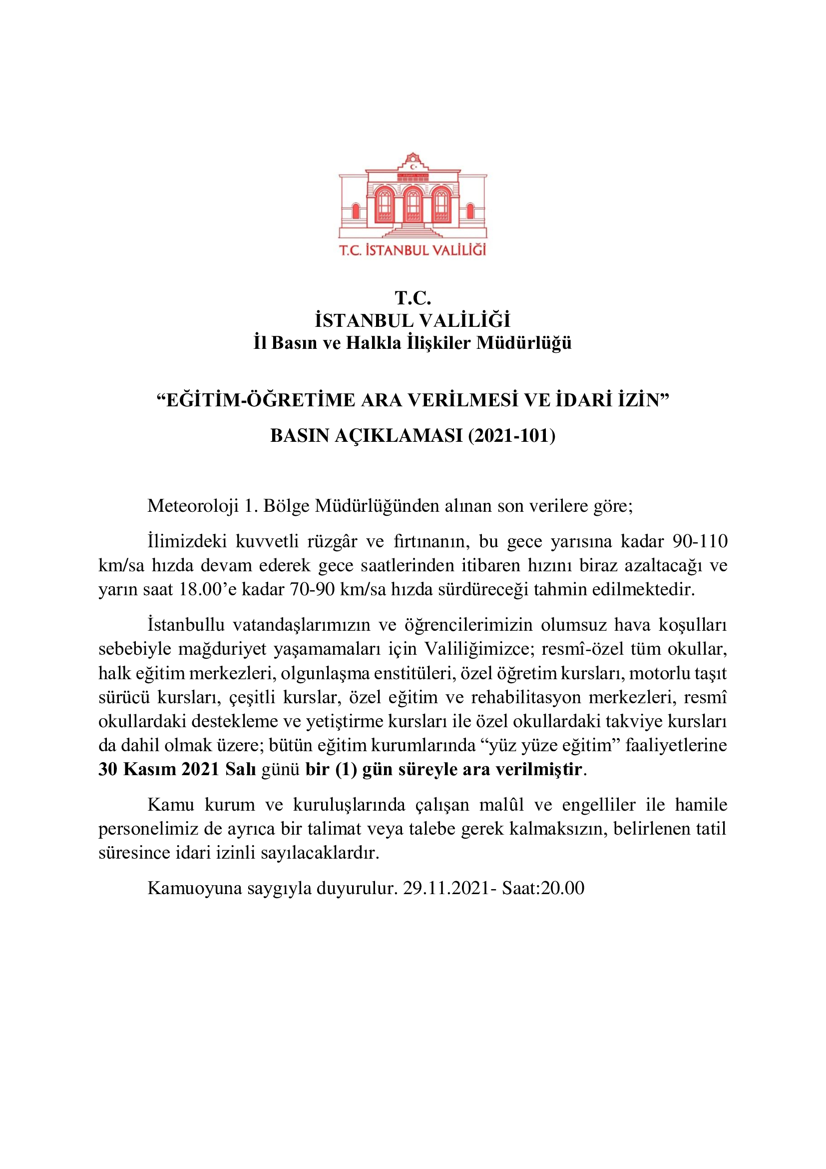 İstanbul’da kuvvetli rüzgar ve fırtına nedeniyle eğitime yarın (30 Kasım 2021) bir gün ara verildi. Öte yandan kamu kurumlarında çalışan engelli ve hamile personel de izinli sayılacak.