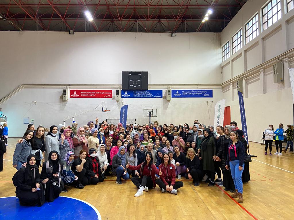 R. Şahin Köktürk Spor Kompleksi’nde sabah saatlerinde başlayan etkinlik yoğun ilgi gördü. Spor hocaları eşliğinde ilk olarak yürüyüş ve ısınma turları yapan kadınlar aerobikle zindelik kazandı.