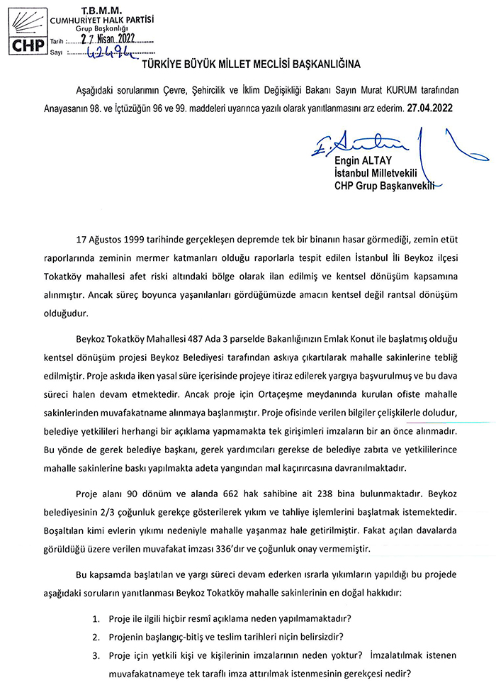 Geçtiğimiz günlerde Engin Altay, Tokatköy Mahallesi’nde gerçekleşen kentsel dönüşüm bölgesindeki vatandaşları ziyaret eden CHP Grup Başkanvekili ve İstanbul Milletvekili Engin Altay, Çevre Şehircilik ve İklim Değişikliği Bakanı Murat Kurum’un yanıtlaması üzerine Türkiye Büyük Millet Meclisi’ne soru önergesi verdi.