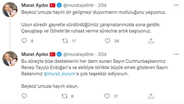 Yaşanan müjdeli gelişmeyi twitter hesabından duyuran Beykoz Belediye Başkanı Murat Aydın: “Beykoz’umuza hayırlı bir gelişmeyi duyurmanın mutluluğunu yaşıyoruz. Uzun süredir gayretle sürdürdüğümüz çalışmalarımızda sona geldik: Çavuşbaşı ve Görele’de ruhsat verme sürecine artık başlıyoruz. Bu süreçte bize desteklerini her daim sunan sayın Cumhurbaşkanımız Recep Tayyip Erdoğan’a ve ekibiyle birlikte büyük emek gösteren Sayın Bakanımız Murat Kurum’a çok teşekkür ediyorum.