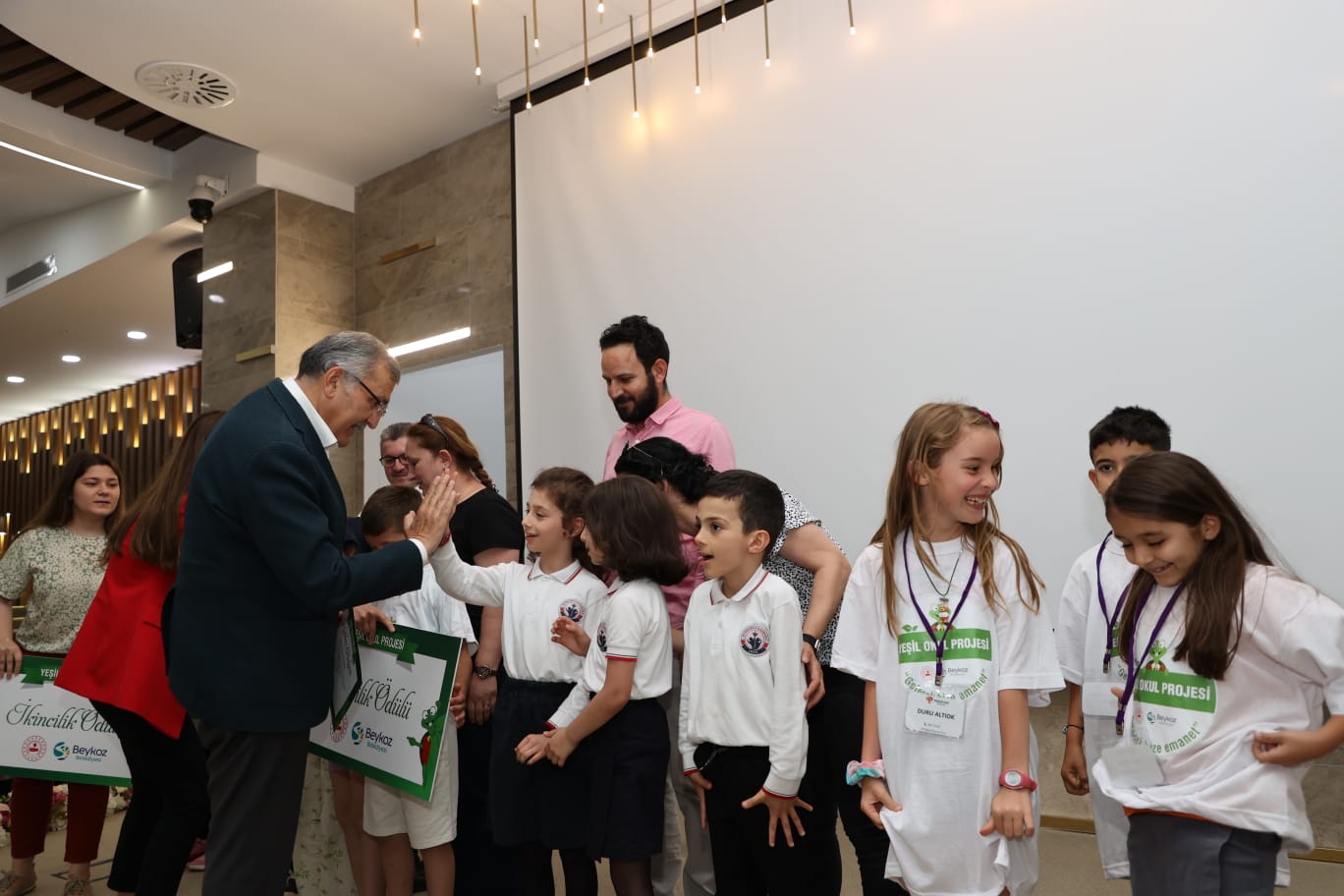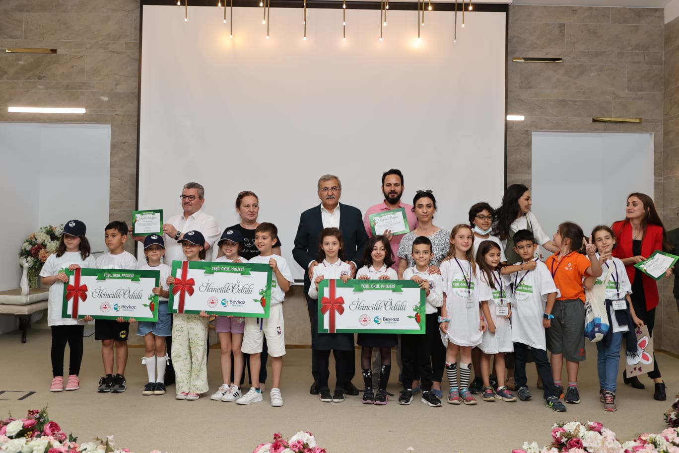 Yeşil Okullar’a ödüllerini takdim eden Beykoz Belediye Başkanı Murat Aydın, çevreye katkıları dolayısıyla başta dereceye giren okullar olmak üzere projede yer alan tüm öğretmen ve öğrencileri kutladı.