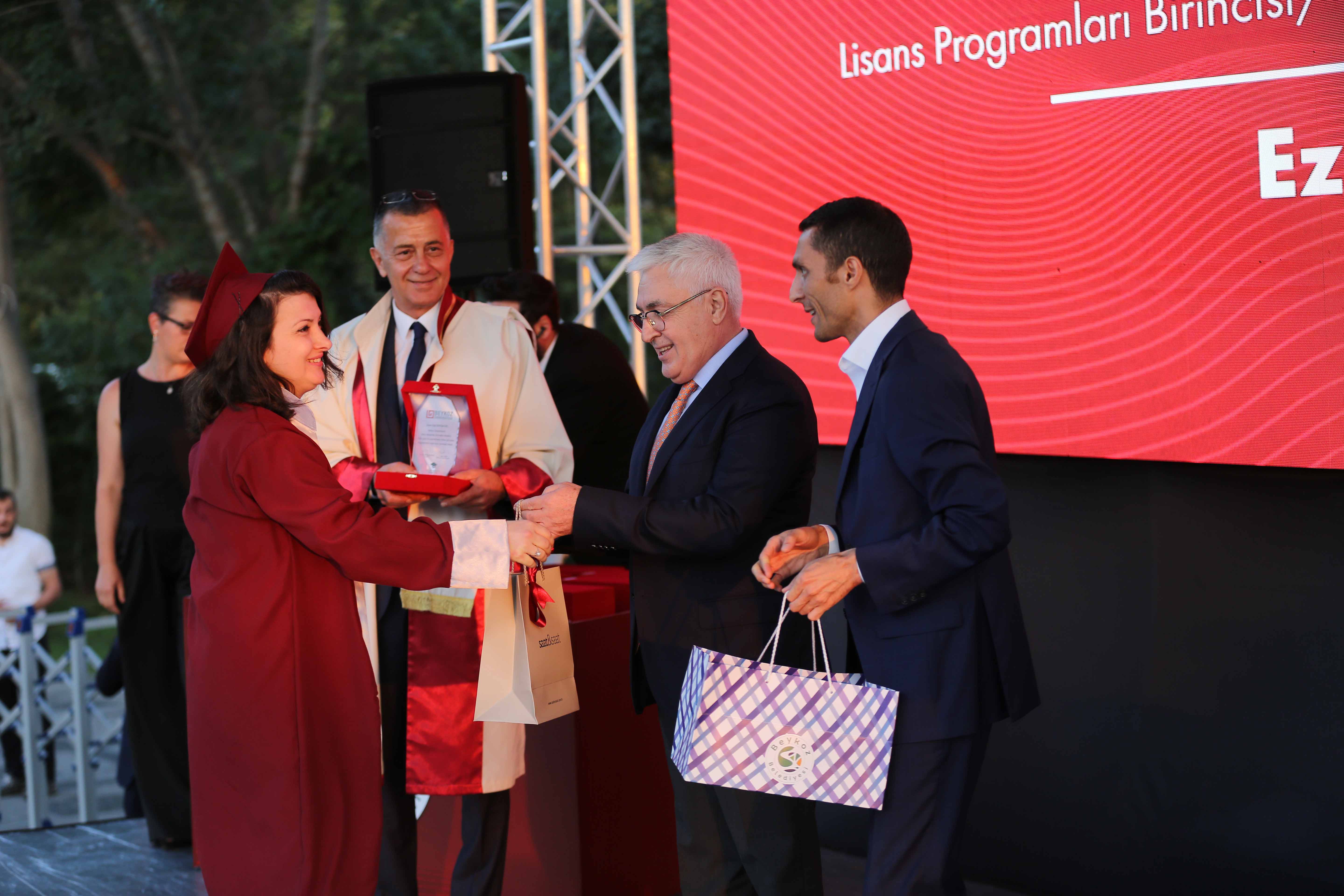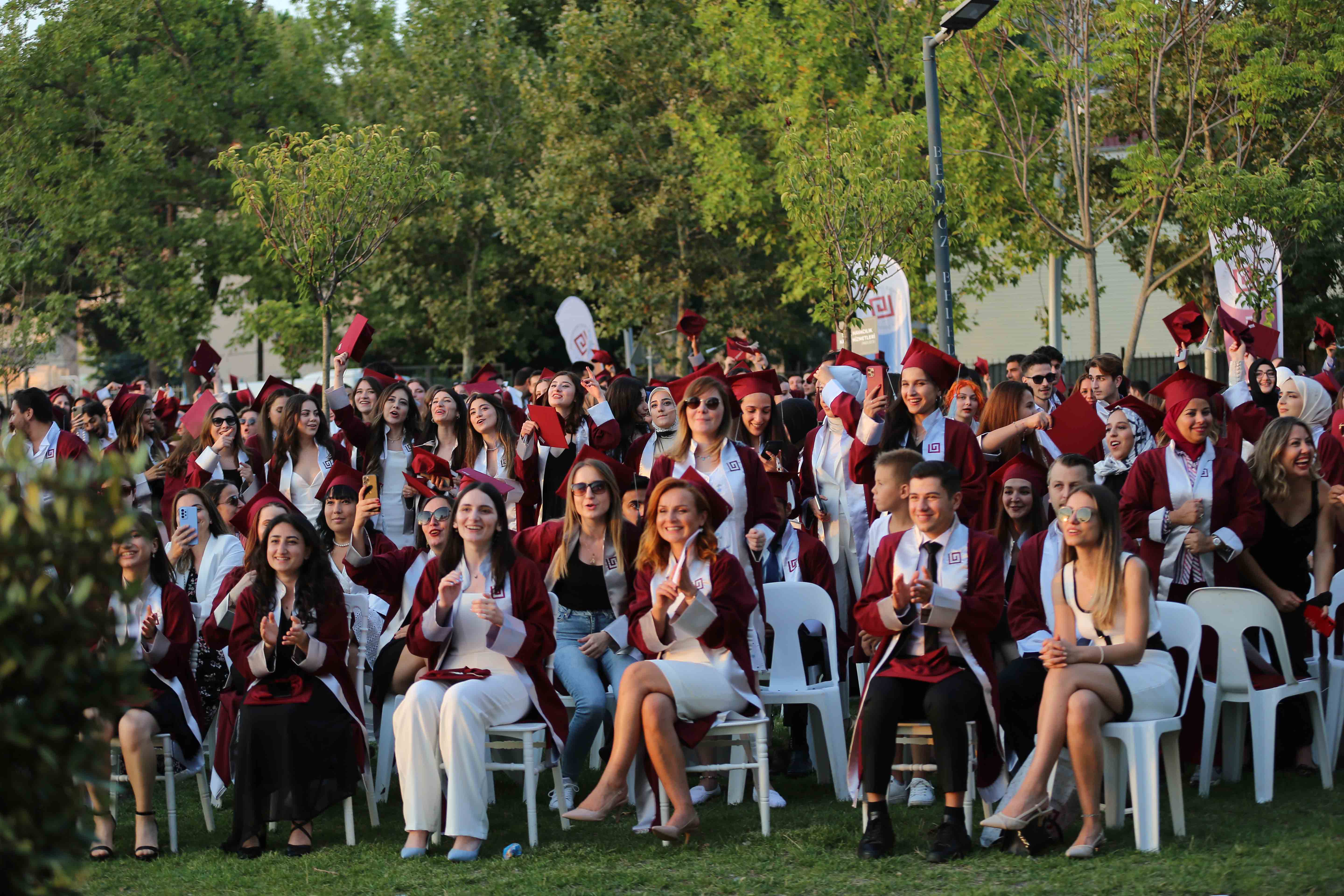 “Bu törendeki en büyük mutluluğumuz ve gururumuz, bugün burada üniversitemizden 1.500’ü aşkın öğrencimizi başarılı bir şekilde mezun ediyor ve onları hayata uğurluyor olmamız. Geçen yıl lisans programlarımızdan ilk mezunlarımızı vermiştik. Bu yıl da 10 lisans programımızdan ilk mezunlarımızı vermenin mutluluğunu yaşıyoruz. Yine, bu yıl ilk defa lisans programlarımızın mezunları arasında dünyanın değişik coğrafyalarından üniversitemize öğrenimleri için gelen uluslararası öğrencilerimiz de bulunuyor. Üniversitemizde şu anda 500’e yakın uluslararası öğrenci öğrenim görüyor. Ayrıca ön lisans, lisans ve yüksek lisans programlarımızdan not ortalamalarıyla ilk üç dereceye girerek mezun olan öğrencilerimizin 11’i kadın, 1’i erkek öğrencimiz. Kadın mezunlarımız bu yüksek başarılarından dolayı güçlü bir takdiri hak ediyorlar.”