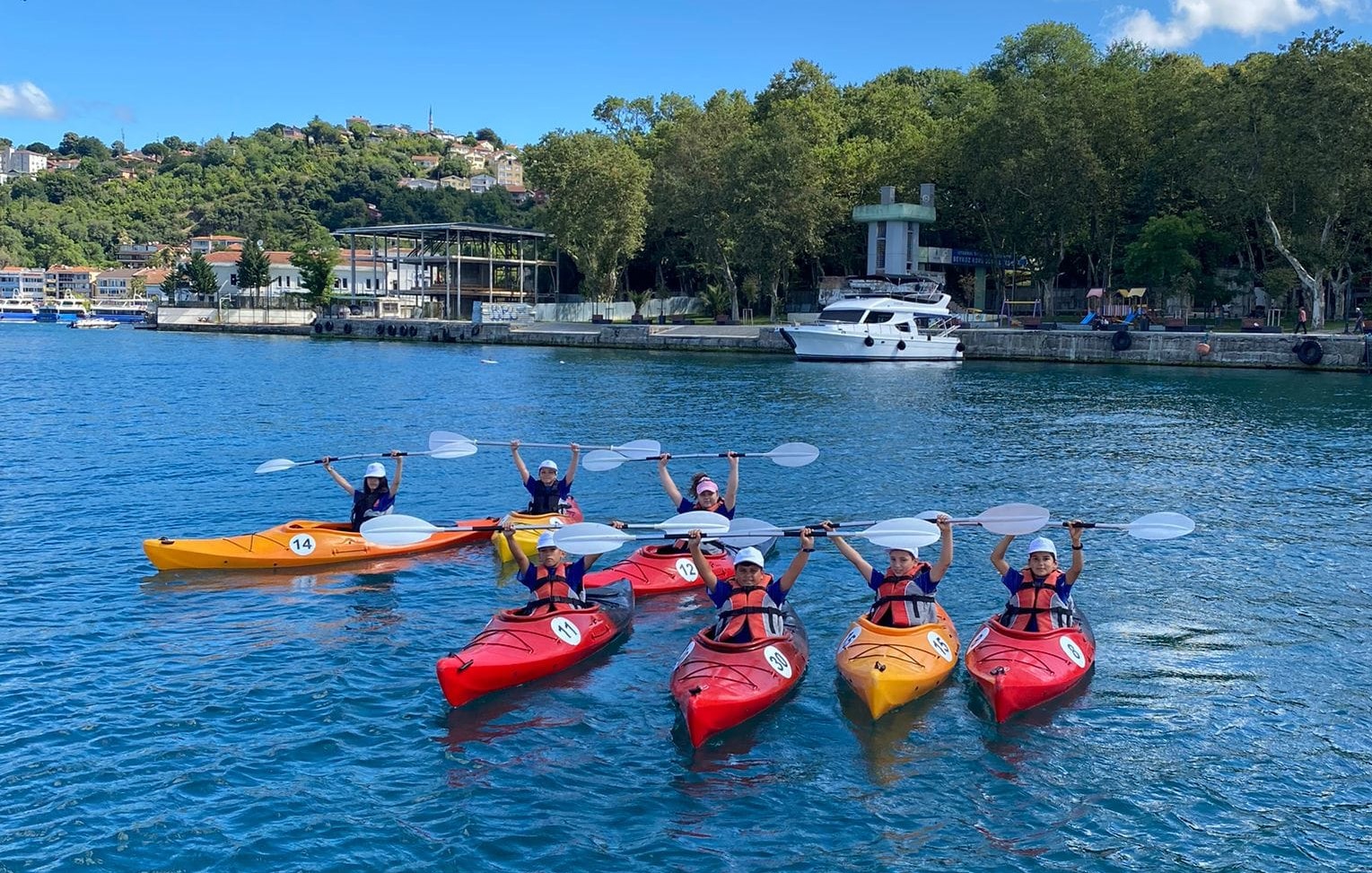 Su Sporları Merkezi’ne kano yapmak için gelenlere öncelikle ekipmanlar ve kullanımları anlatılıyor, ardından eğitmenler eşliğinde Boğaz’da kürek çekiliyor.