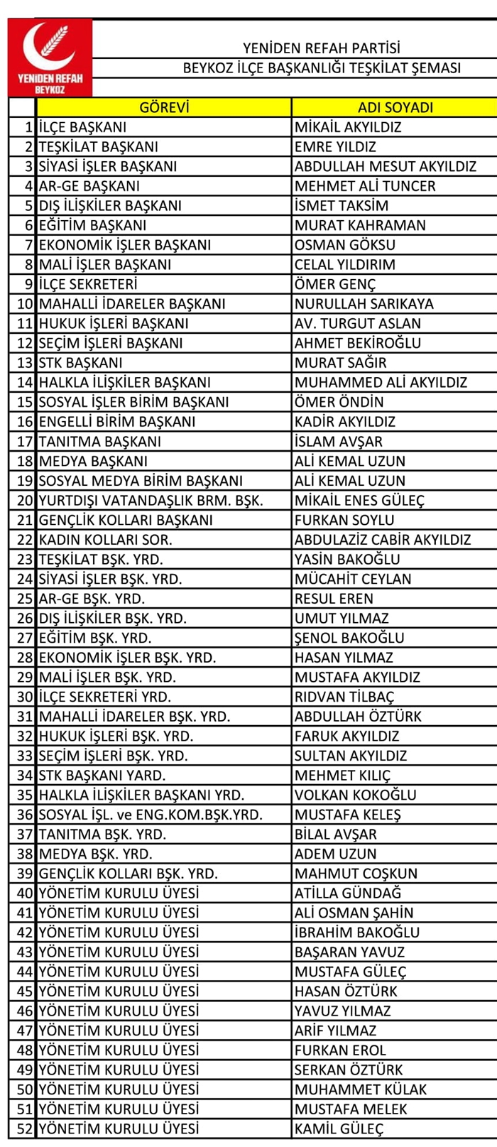 Atanmasıyla birlikte hızlı bir program trafiğine giren ve Genel Başkan Dr. Fatih Erbakan’ı Beykoz’da ağırlayan Yeniden Refah Partisi İlçe Başkanı Mikail Akyıldız, Beykoz İlçe Yönetimini oluşturdu.