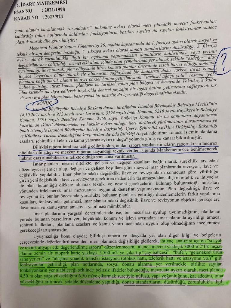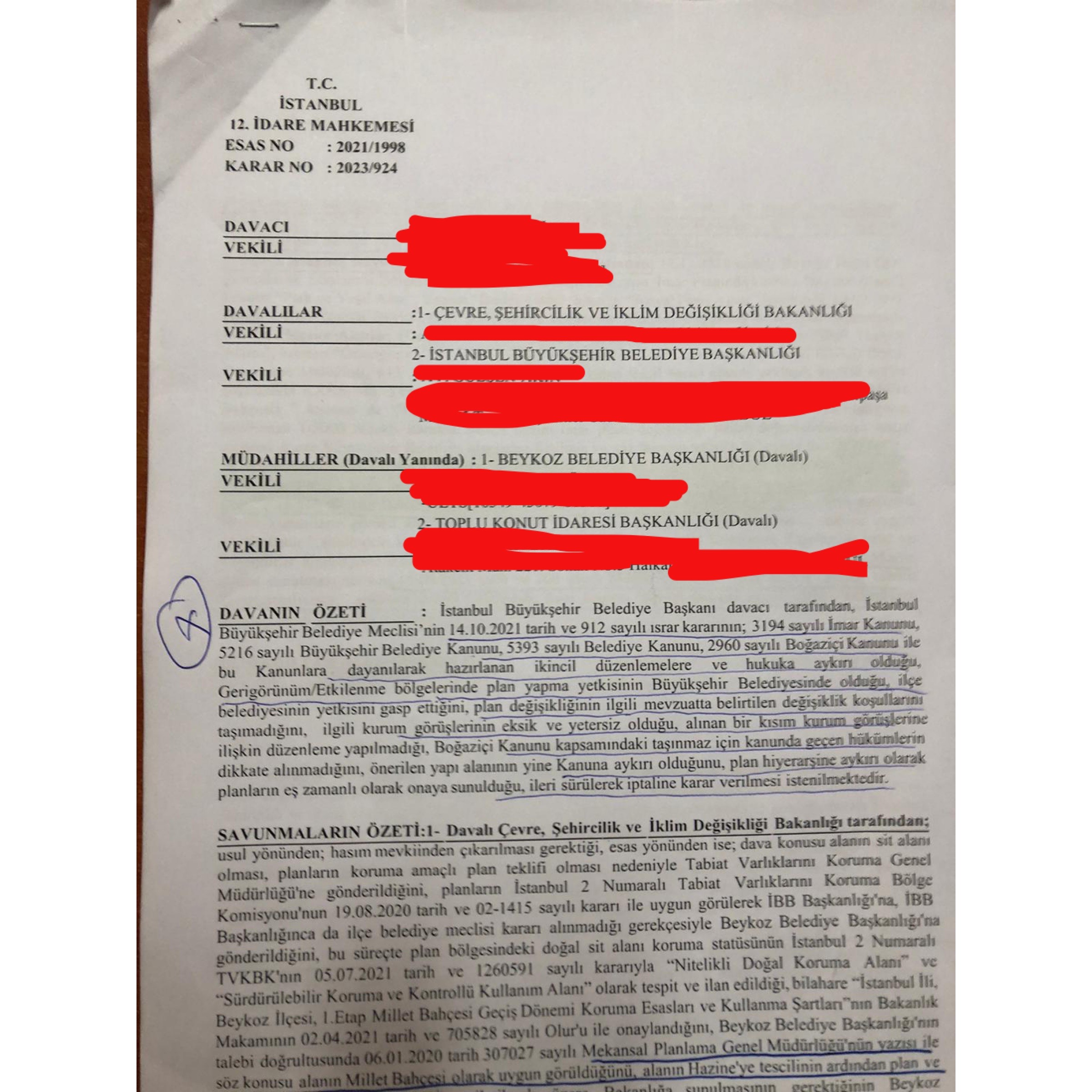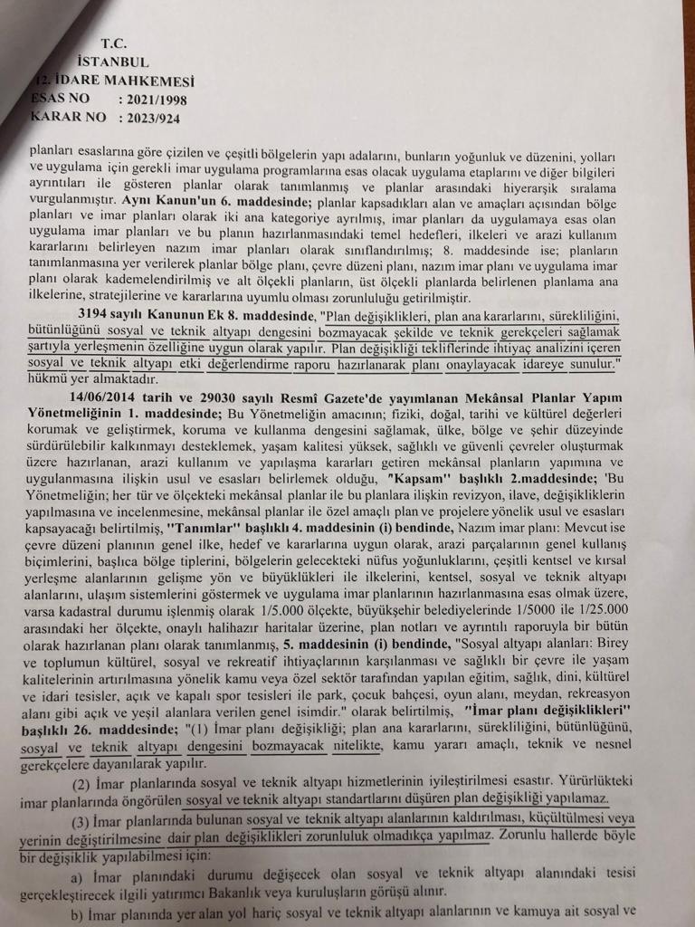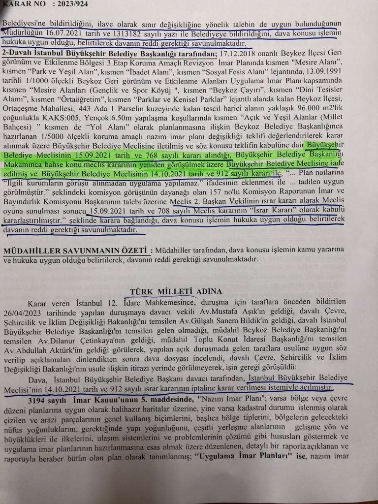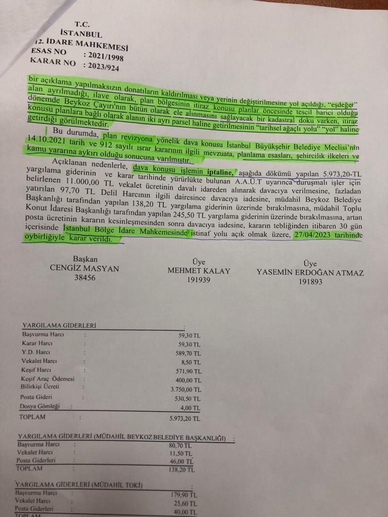 Dosyayı inceleyen İstanbul 12. İdare Mahkemesi, İBB Meclisi’nin ısrar kararının ilgili mevzuata, planlama esaslarına, şehircilik ilkeleri ve kamu yaranına aykırı olduğu sonucuna vardı. Dava konusu işlemin iptaline 27 Nisan 2023 tarihinde oy birliği ile karar verildi.