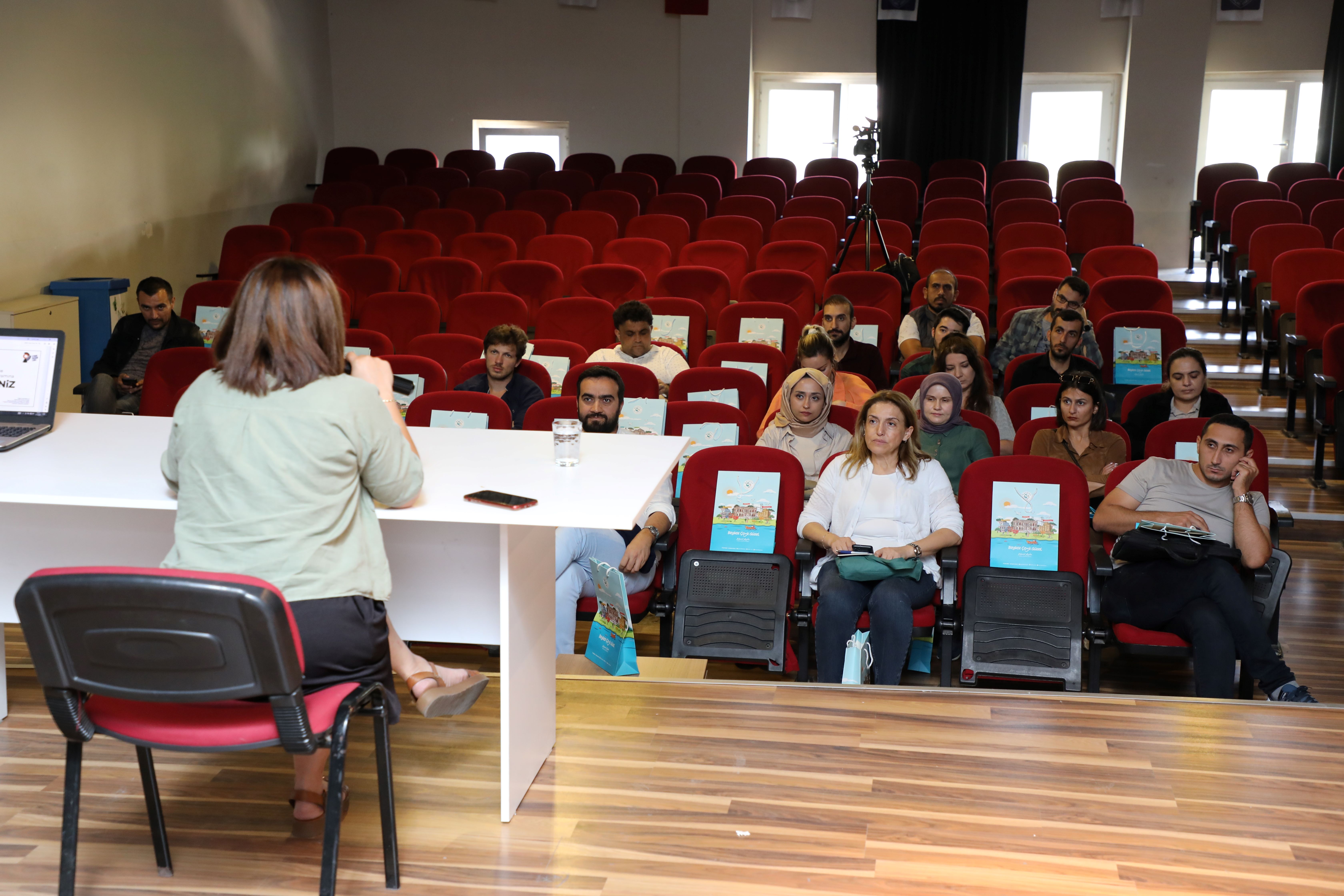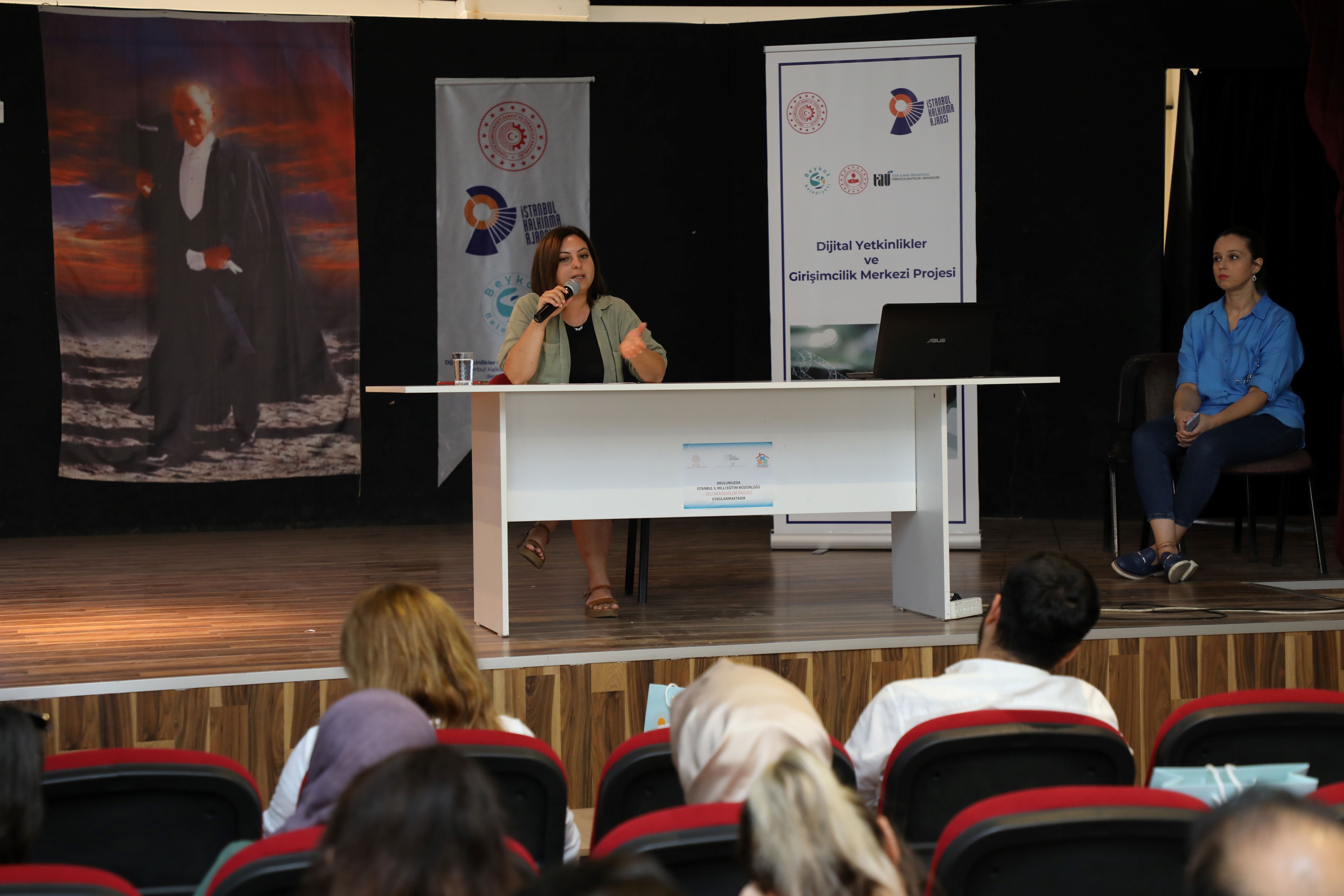 Türk-Alman Üniversitesi Dr. Öğretim Üyesi Ayça Yılmaz Deniz tarafından verilen “Dijitalleşme ve Çalışma Hayatı” konulu semineri ilçedeki ortaokul ve liselerden farklı branşlarda öğretmenler izledi.