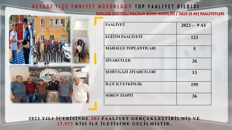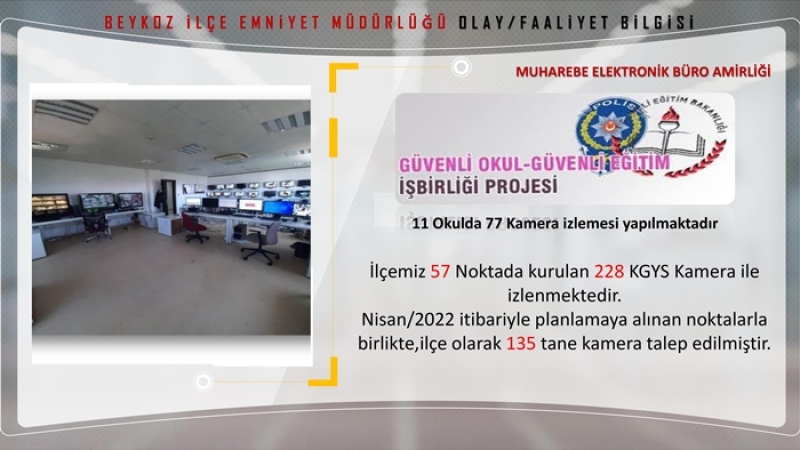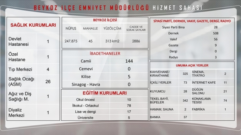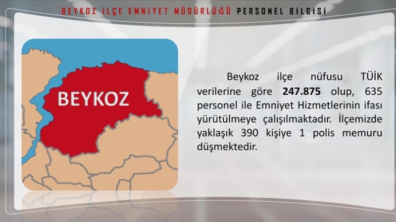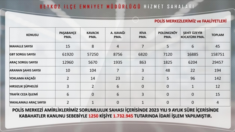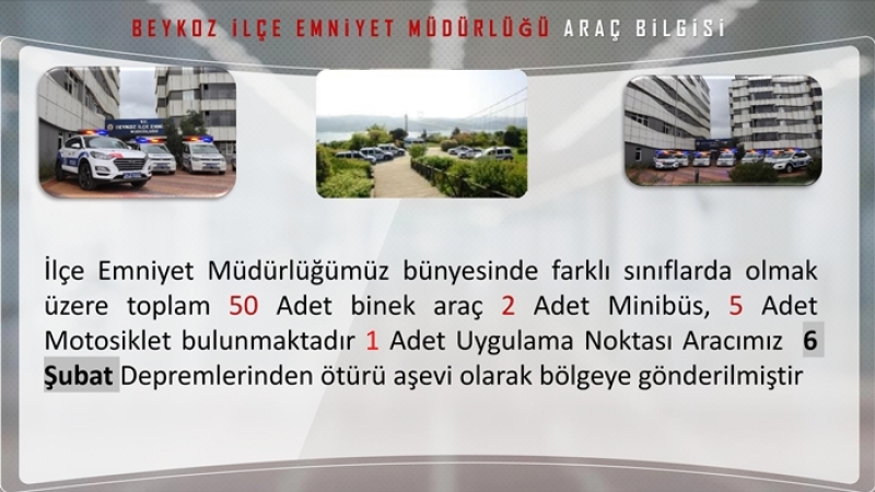 “Takdir edersiniz ki, Anadoluhisarı’ndan Anadolufeneri’ne kadar olan geniş coğrafyadaki denetim alanını ve umuma açık yerlerin denetimini ilçe emniyet müdürlüğümüz personeli yapmaktadır” şeklinde konuşan Öztürk, “Biz bu hizmetleri 635 personel ve 57 aracımızla yapmaktayız. Geçen sene huzur toplantısında sizlere arz etmiştim. Geçen sene personel sayımız beş yüz doksandı. Bu sene karşınızda 635 personelle bulunmaktayız. Toplam geçen sene kırk dokuz araç vardı ve bu sene 57 aracımız bulunmaktadır.” dedi.