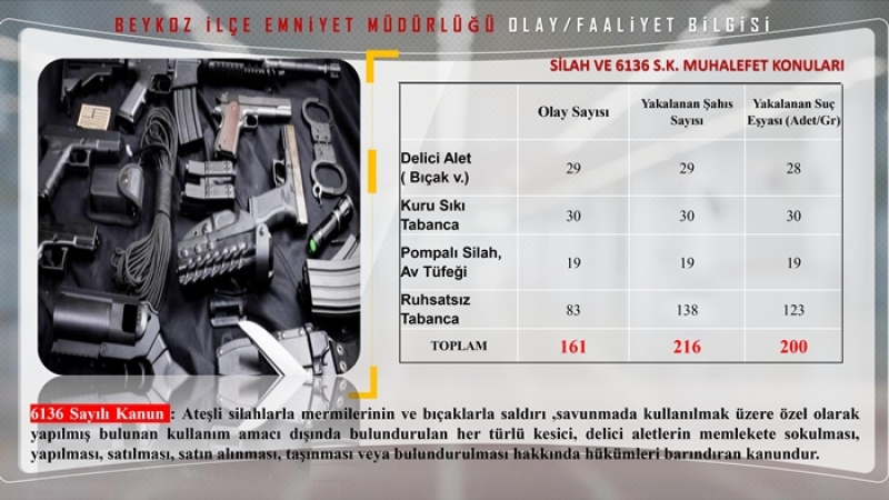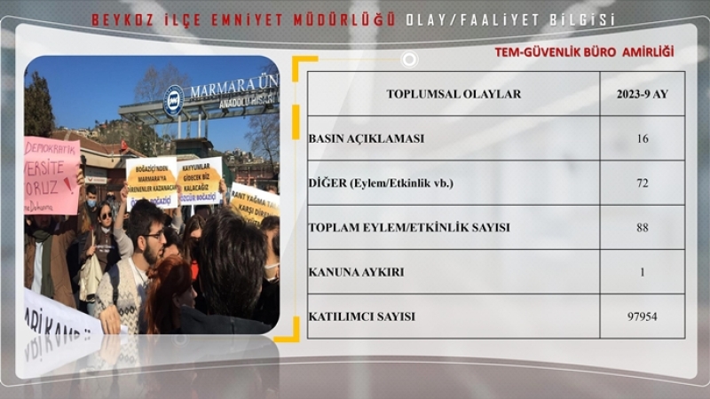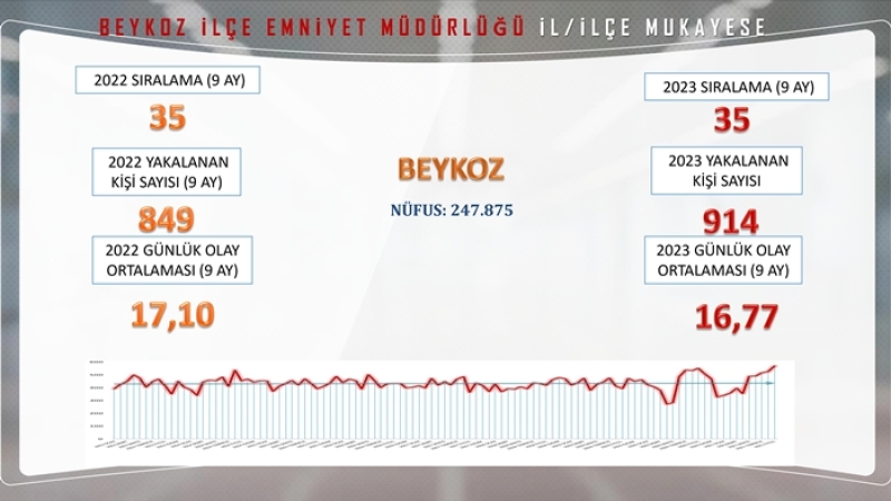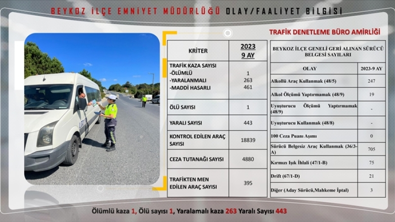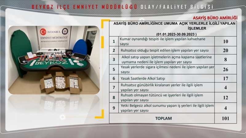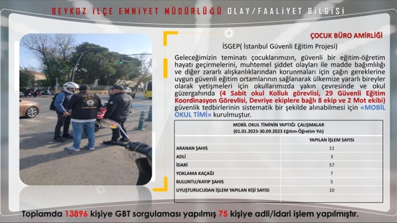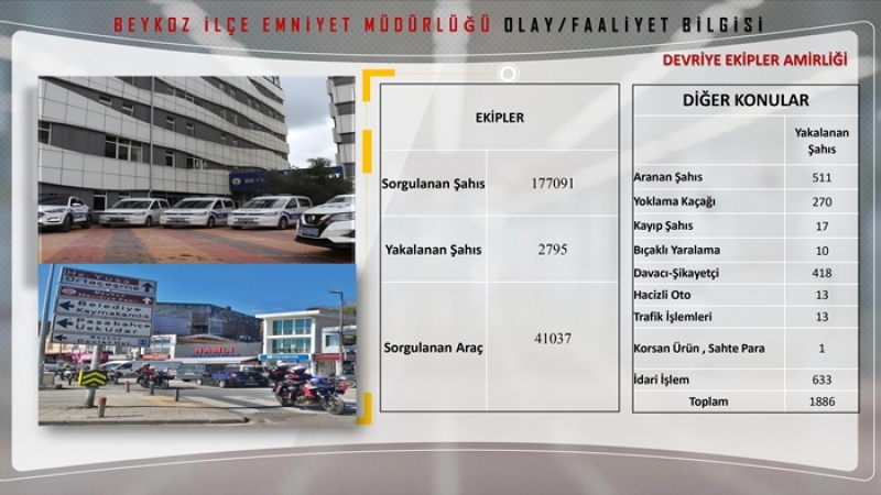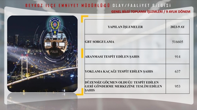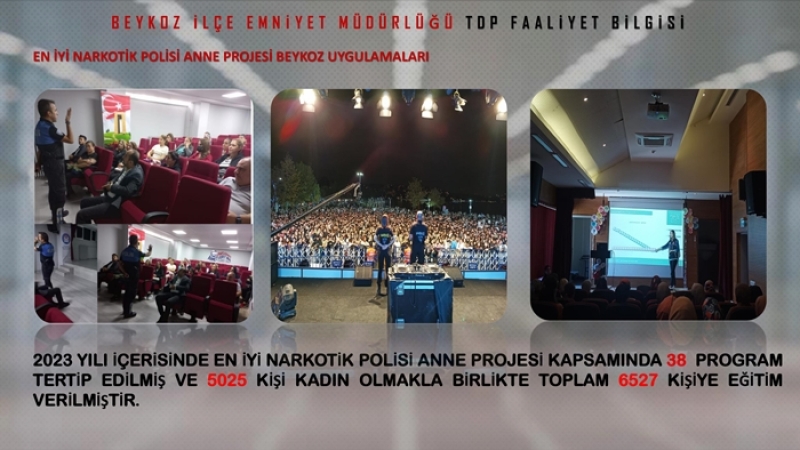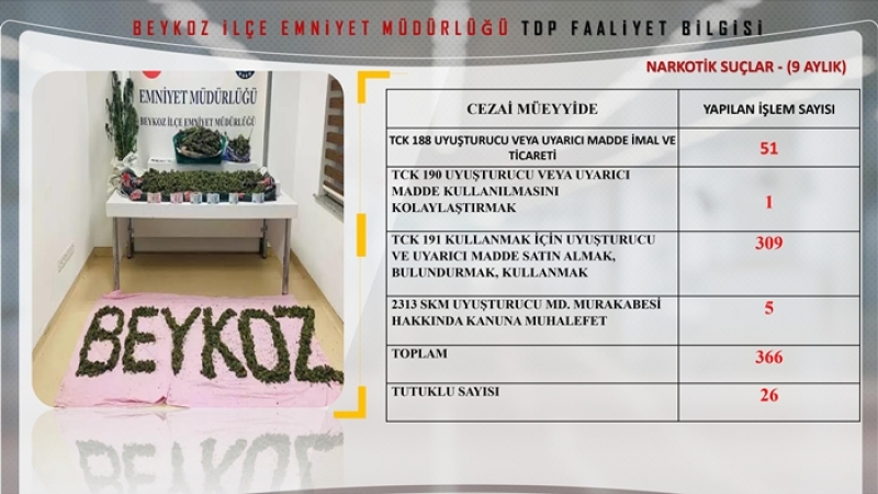 Beykoz İlçe Emniyet Müdürü Hakan Öztürk, Beykoz’da 2 olan trafik ekibinin 5’e çıkartılmasının planlandığını ve 2024 yılına bu şekilde girmeyi ümit ettiklerini dile getirerek, özellikle Beykoz’da tartışma konusu olan uyuşturucu kullanımına yönelik değerlendirmeler de bulundu.Beykoz’da 366 kişiye uyuşturucudan işlem yapıldı