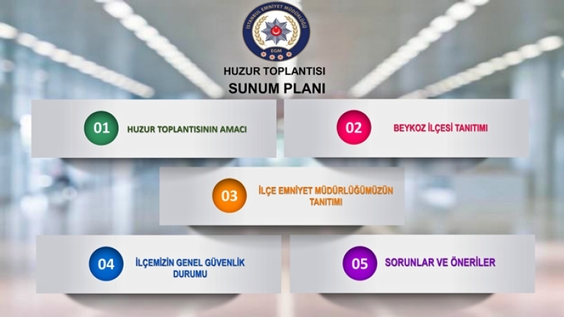 Beykoz İlçe Emniyet Müdürlüğü’nün her yıl kamuoyunu bilgilendirmek amacıyla hazırlamış olduğu huzur toplantısı yapıldı.Kavacık Yaşam Merkezinde gerçekleştirilen toplantıda; Beykoz Kaymakamı Faik Oktay Sözer, Beykoz Belediye Başkanı Murat Aydın ve Beykoz İlçe Emniyet Müdürü Hakan Öztürk sorulara cevap verdi.Beykoz Cumhuriyet Başsavcısı Mehmet Aydın, İlçe Milli Eğitim Müdürü Sevcenur Özcan, Beykoz Devlet Hastanesi Başhekimi Op. Dr. Süleyman Erdoğdu, Beykoz İlçe Sağlık Müdürü Dr. Ahmet Emin Çörtük, Sosyal Güvenlik Merkezi Müdürü Ferda Özkalender gibi bürokratik isimlerin katıldığı toplantıya, çok sayıda mahalle muhtarı ve STK temsilcisi de hazır bulundu.Beykoz Belediye Başkan Yardımcısı Fatih Sağlam, CHP Beykoz İlçe Başkanı Mahir Taştan, İYİ Parti Beykoz İlçe Başkanı Akif Taşdemir, Saadet Partisi Beykoz İlçe Başkanı Yaşar Ahmet Akkuzu, Beykoz Polis Hizmetlerini Koruma Derneği Başkanı Birzat Mermer, Bes Teknoloji Yönetim Kurulu Başkanı Mubin Çakmak ve Beykoz Muhtarlar Derneği Başkanı Sedat Altun’un da konuklar arasında yer aldığı toplantı saygı duruşu ve İstiklal Marşı’nın okunmasıyla başladı.Toplantının açılış konuşmasını yapan Beykoz İlçe Emniyet Müdürü Hakan Öztürk, bölgenin asayişine yönelik yapılan çalışmalardan elde edilen istatistik rakamlarını paylaştı.