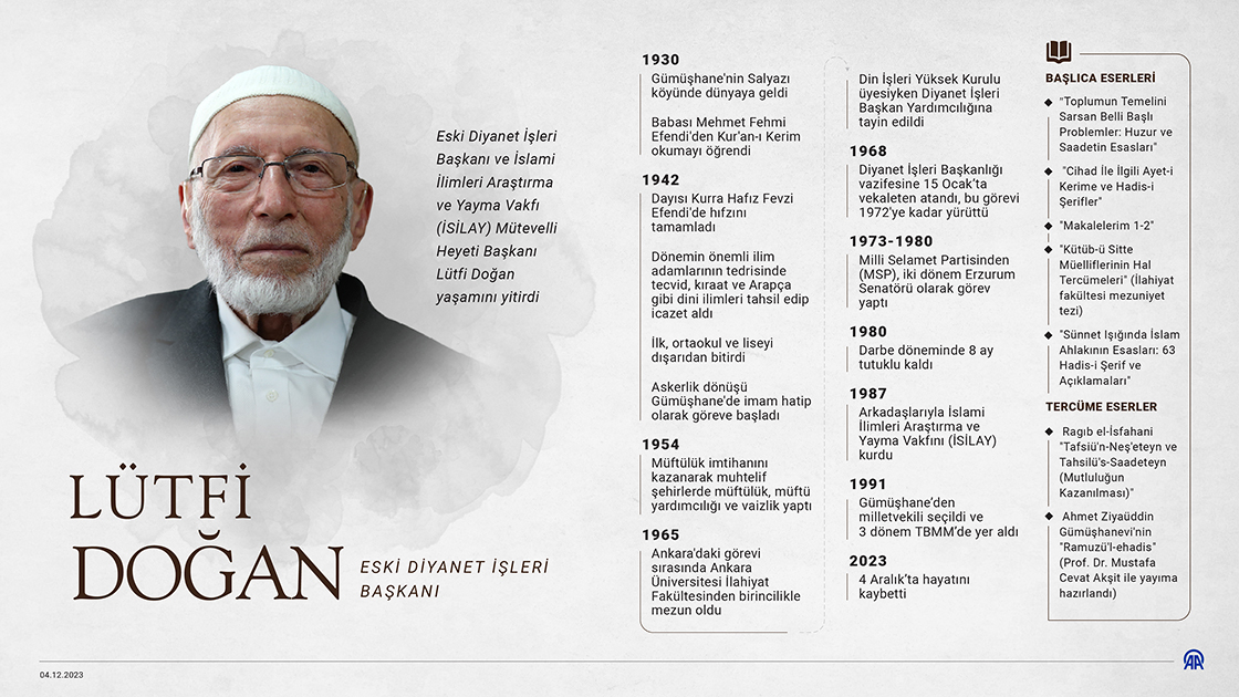 Beykoz Devlet Hastanesi Başhekimi Op. Dr. Süleyman Erdoğdu’nun kayınpederi, eski Diyanet İşleri Başkanı ve İslami İlimleri Araştırma ve Yayma Vakfı (İSİLAY) Mütevelli Heyeti Başkanı Lütfi Doğan doksan üç yaşında hayatını kaybetti.