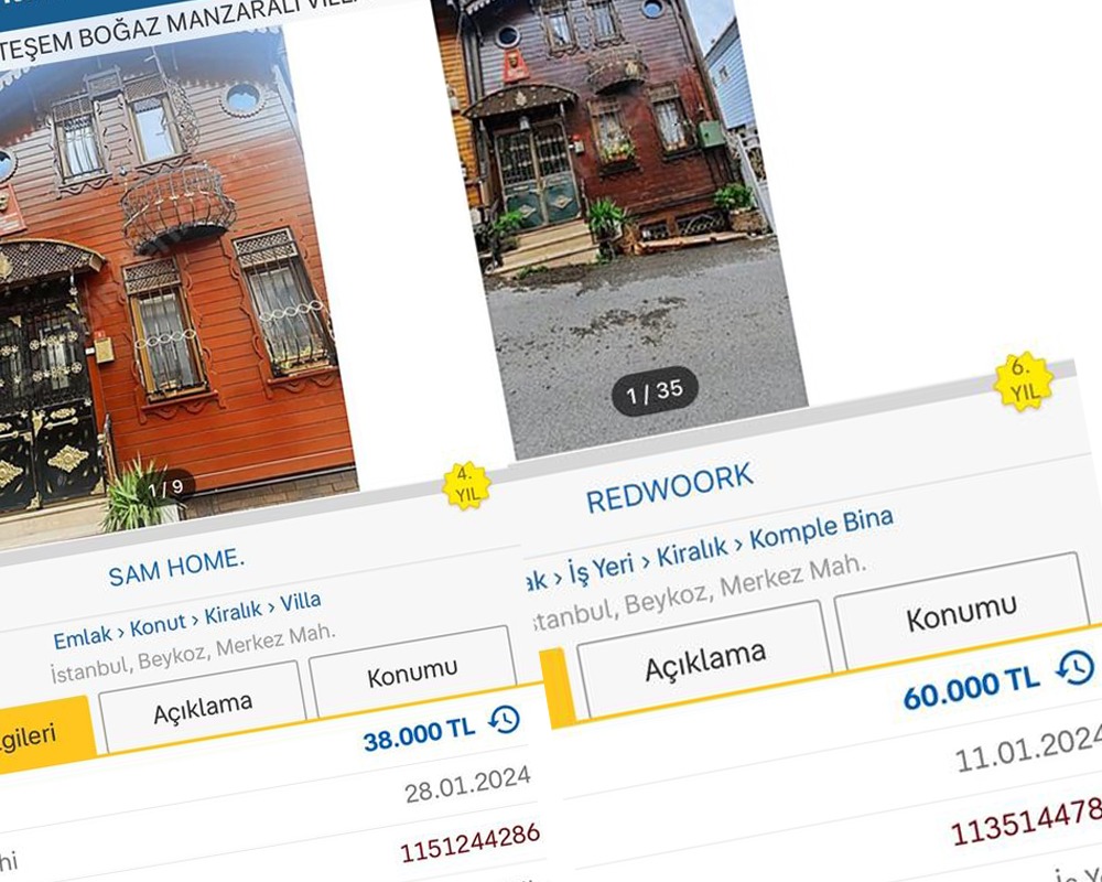 Aynı ev, aynı uygulamada 28 Ocak 2024 günü 38 bin liraya, 11 Ocak 2024 günü 60 bin liraya farklı emlak firmaları üzerinden kiraya verildi.