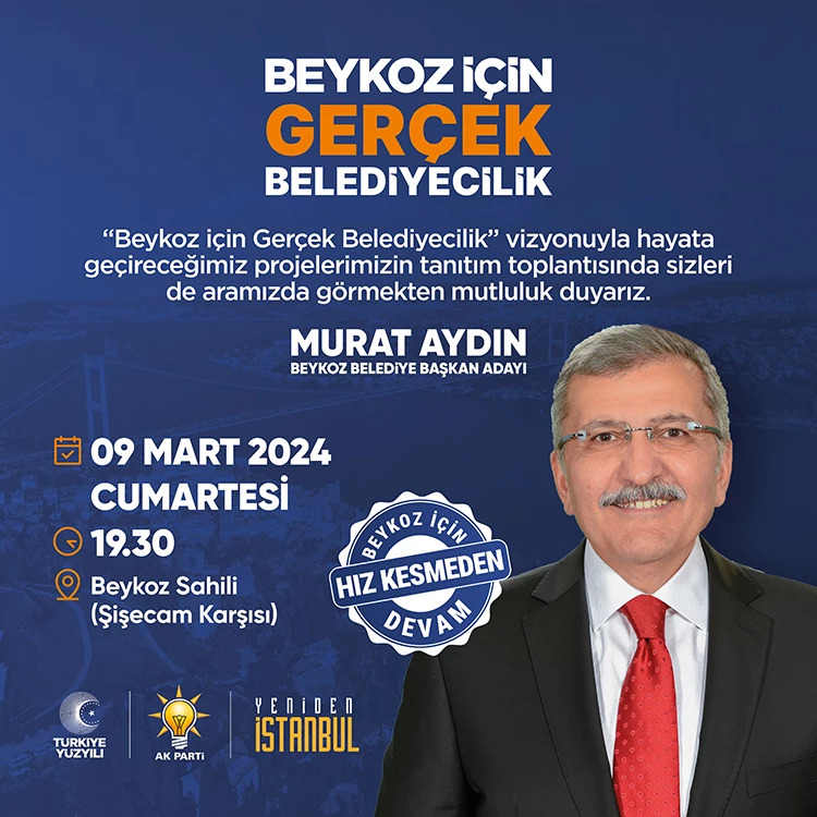 2024 Yerel Seçim’lerine bir ay süre kala sahadaki çalışmalar hızlandı. Beykoz Belediye Başkanı ve AK Parti Beykoz Belediye Başkan Adayı Murat Aydın yeni döneme yönelik projelerini büyük bir lansman ile Beykoz’a duyurmak için geri sayıma başladı.