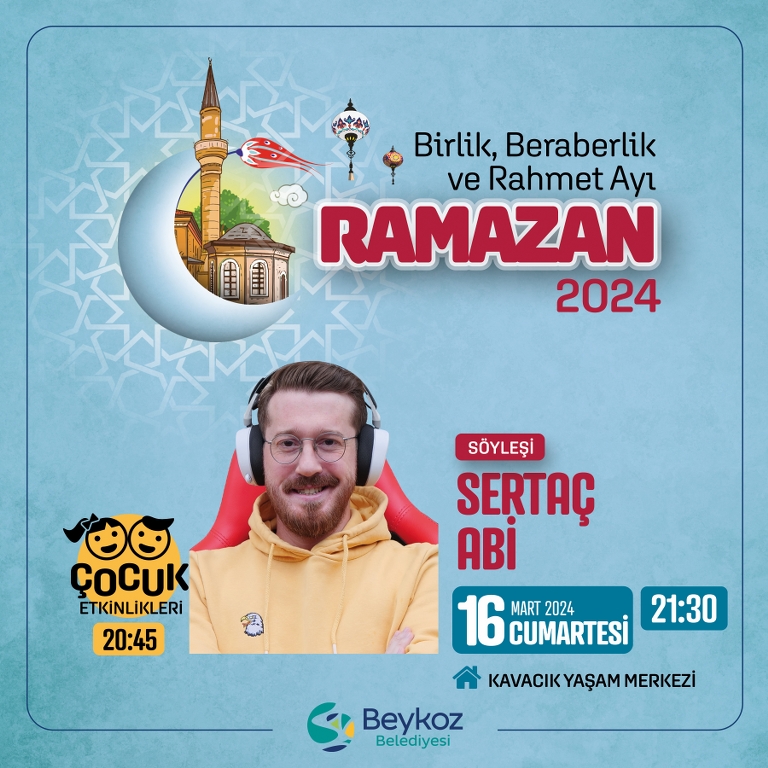 Beykozlu çocukların Ramazan sevincini doyasıyla yaşayacağı etkinliklere Youtuber “Sertaç Abi” neşeli bir söyleşiyle katılacak.