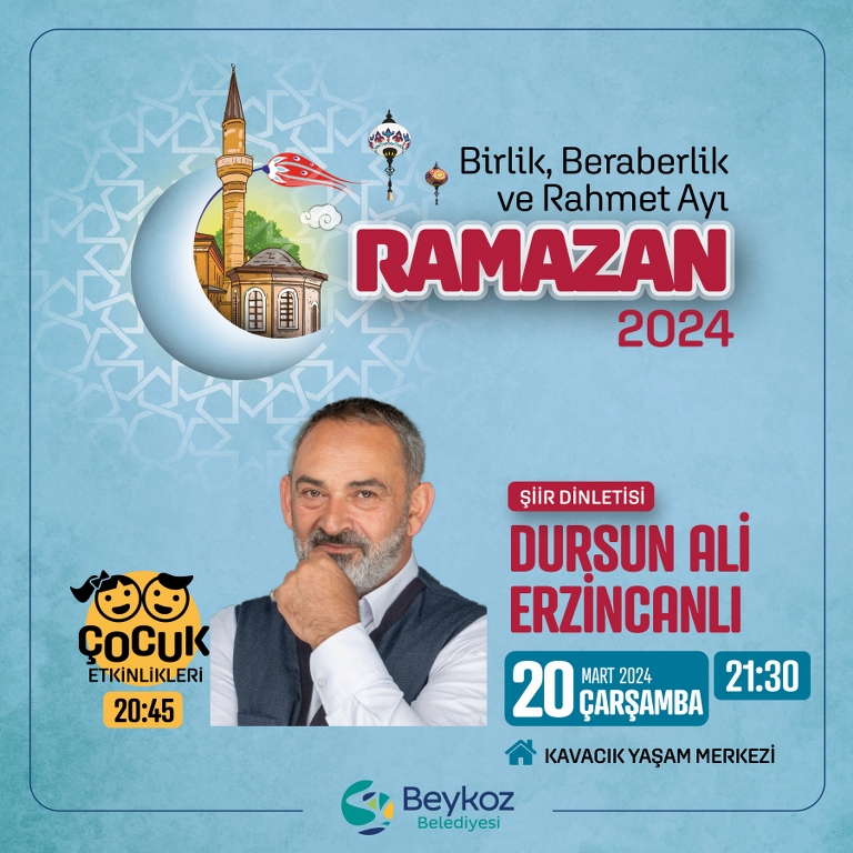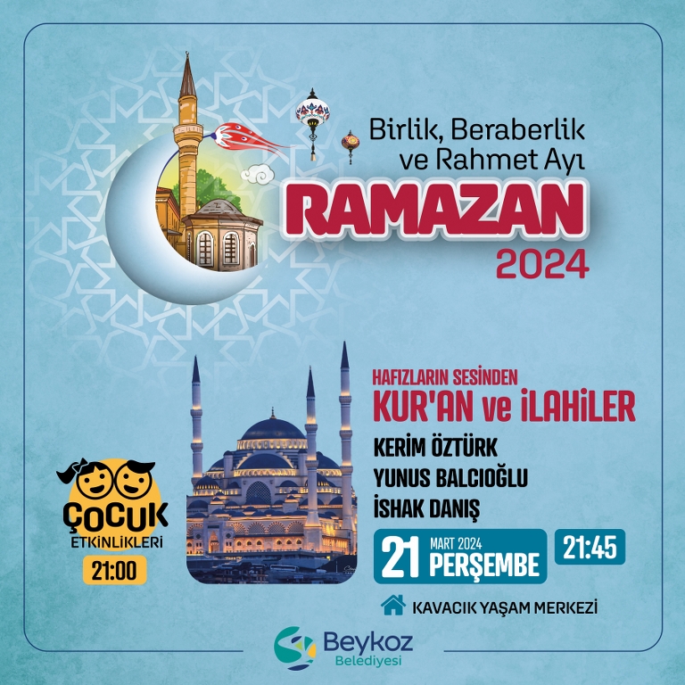 Ramazan Ayı tüm Beykoz’u ilçe sahilinde kurulan “Ramazan Çadırı” ile Kavacık “Millet Sofrası”nda kardeşlik ve dayanışma iklimiyle kuşatıyor, “Kavacık Yaşam Merkezi’nde söyleşiler, konserler ve çocuk eğlenceleriyle dopdolu etkinlikler yer alıyor. Beykoz Belediyesi’nin, halka açık iftar sofralarından geleneksel çocuk eğlencelerine, sevilen ilahiyatçılarla söyleşiler, konser ve dinletilere yer verdiği programlar ilçe sakinlerinden yoğun ilgi görüyor.