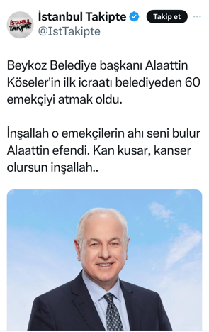 İstanbul Takipte isimli sosyal medya hesabından "İnşallah o emekçinin ahı seni bulur Alaattin Efendi. Kan kusar kanser olursun inşallah..." çirkin ve yersiz bir söylemle birlikte paylaşılan, Beykoz Belediyesi’nden 60 işçinin işten çıkartıldığı iddiasına karşılık basın açıklaması yayınlayan Beykoz Belediye Başkanı Mimar Alaattin Köseler iddianın asılsız olduğunu açıkladı.