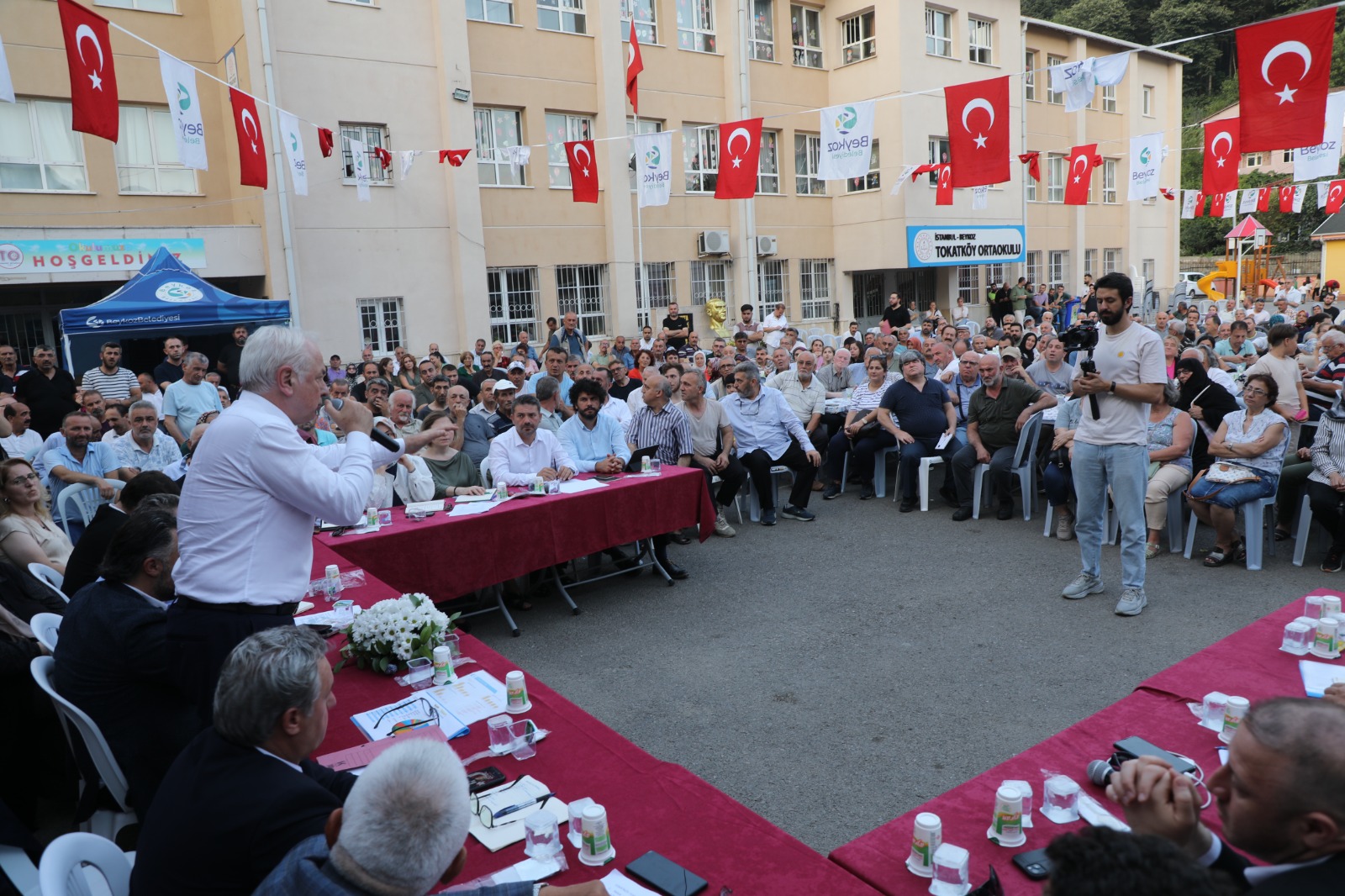 Tokatköy Ortaokulu’nda yapılan toplantıya kuşaktan kuşağa tapu ve imar sorunlarının çözülmesini bekleyen mahalle sakinleri yoğun katılım gösterdi.