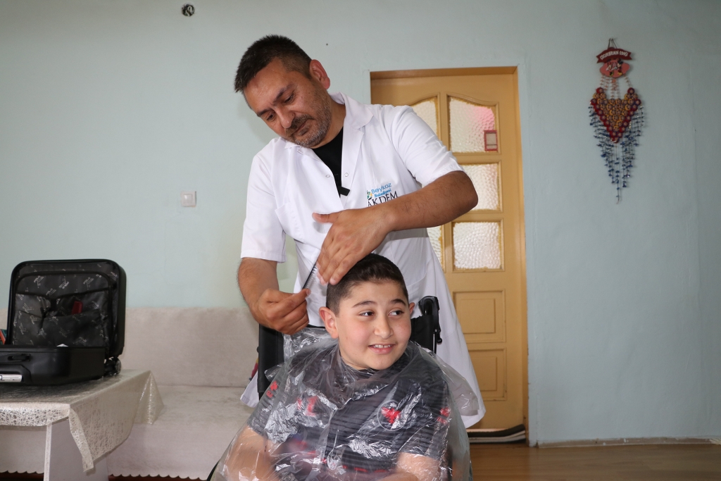 “Evde Kuaför Hizmeti”yle 65 yaş üstü yaşlılar, engel ve yatağa bağımlı kimseler evlerinde ziyaret ediliyor. Randevuyla eve giden kuaförler ihtiyaç sahiplerinin bakımlarını itinayla yapıyor.