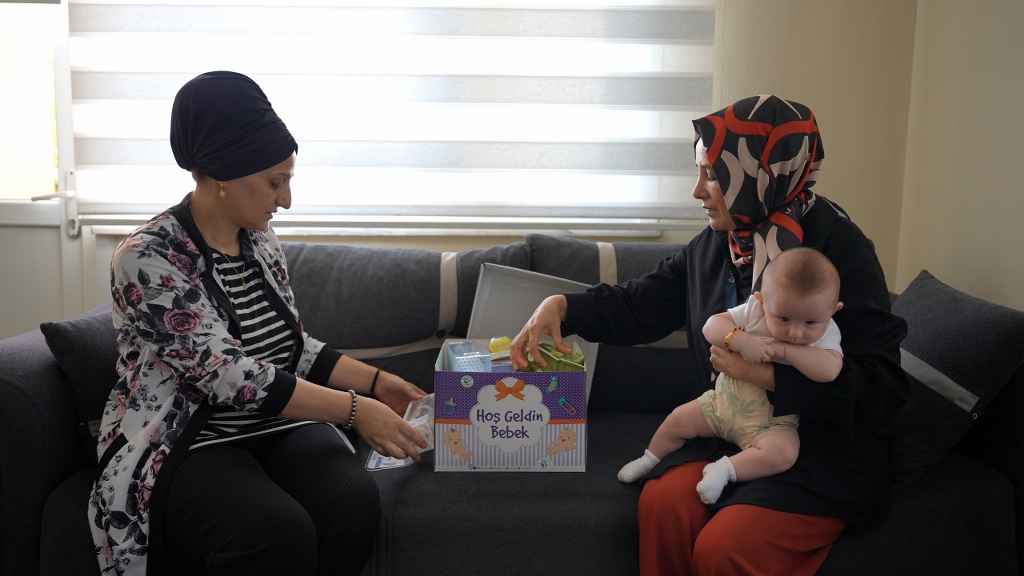 Sosyal yardım işleri ekipleri bugüne kadar talepte bulunan 230 aileyi ziyaret ederek içinde temel bebek bakım malzemeleri olan hediye paketini takdim etti, anne ve babalara güzel dileklerini iletti.