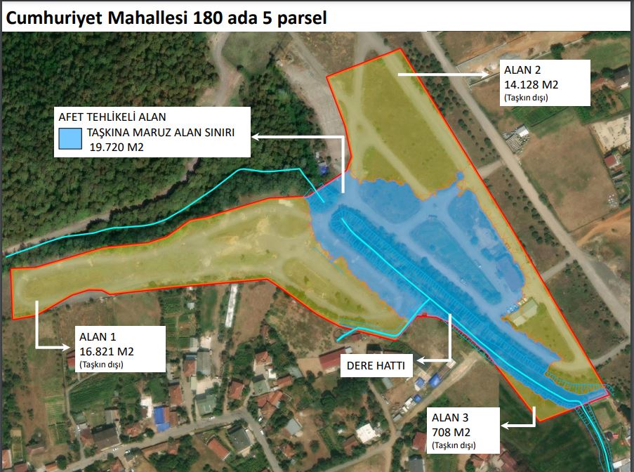 Riva Deresi Çevresi 2. Etap 1/1000 Ölçekli Koruma Amaçlı Uygulama İmar Planı’na göre Cumhuriyet Mahallesi 180 Ada 5 parselde yer alan 51 bin 379 metrekare arazinin yaklaşık 20 bin metrekaresi taşkına maruz alan sınırı içinde kalıyor.