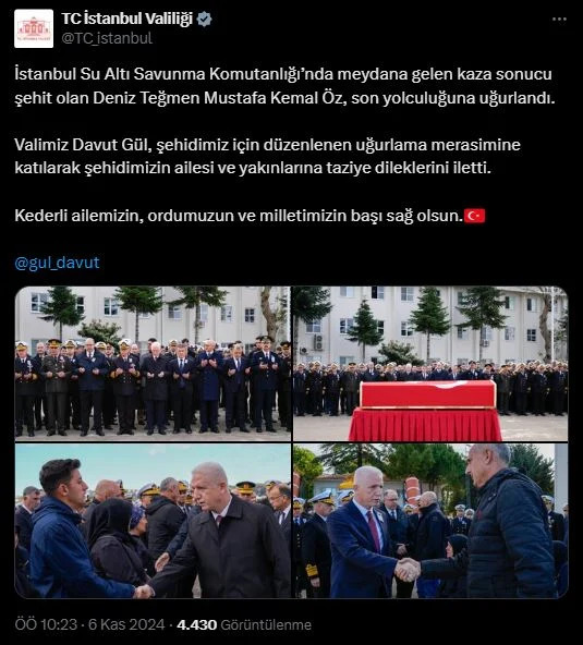 “İstanbul Su Altı Savunma Komutanlığı’nda meydana gelen kaza sonucu şehit olan Deniz Teğmen Mustafa Kemal Öz, son yolculuğuna uğurlandı. Valimiz Davut Gül, şehidimiz için düzenlenen uğurlama merasimine katılarak şehidimizin ailesi ve yakınlarına taziye dileklerini iletti. Kederli ailemizin, ordumuzun ve milletimizin başı sağ olsun”Beykoz siyasilerinden geçmiş olsun mesajları